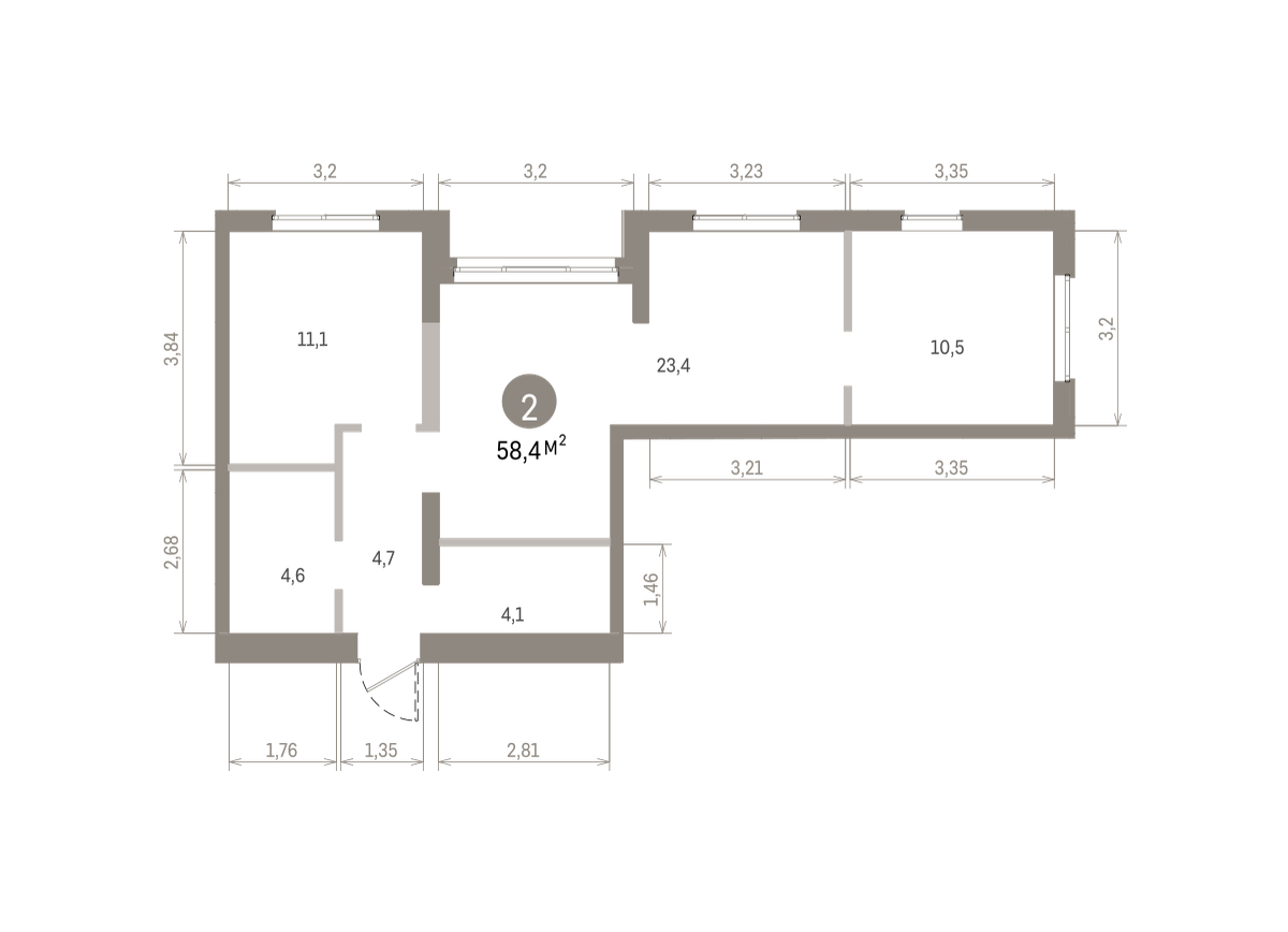 Квартира с кухней-гостиной и двумя спальнями в Южных кварталах. Особенности планировки: гардеробная, предчистовая отделка, разнесённые спальни.