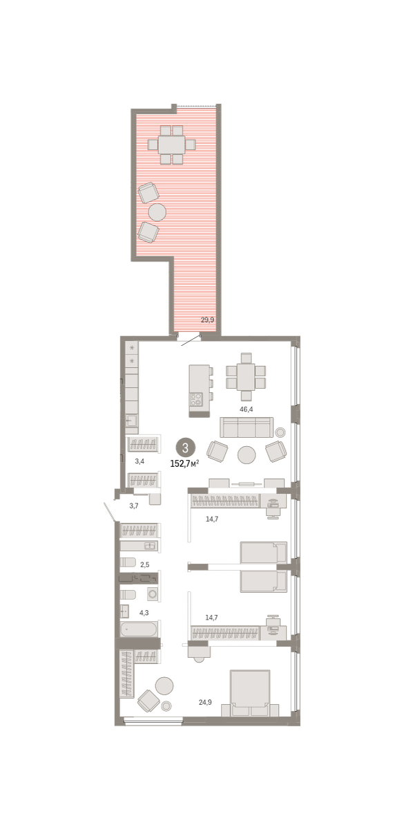 Трёхкомнатная квартира в микрорайоне «Шишимская горка» от застройщика «Брусника» — это квартира с объединенной кухней-гостиной и тремя спальнями. В квартире предусмотрена просторная ванная комната, гостевой санузел, ниши под хранение и гардеробные. Комнаты в трёхкомнатной квартире имеют правильную прямоугольную форму близкую к квадрату. Отсутствуют лишние углы и выступы. Гардеробные зоны и ниши для шкафов помогают разумно использовать пространство 3к квартиры, иметь больше свободного места.