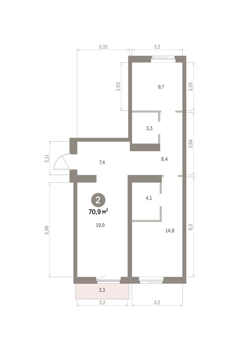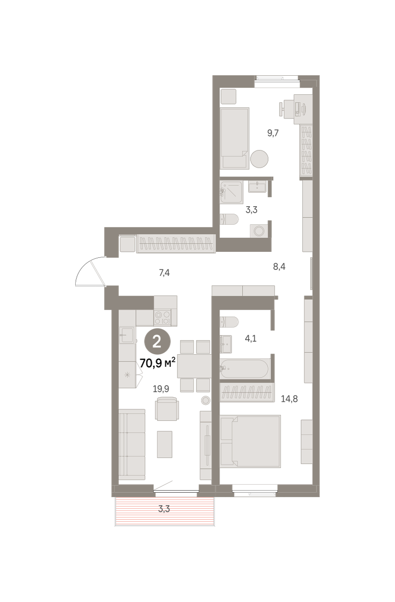Квартира с кухней-гостиной и двумя спальнями в районе Шишимская горка. Особенности планировки: балкон, вид во двор, второй свет, гардеробная, мастер-спальня, окна на две стороны, предчистовая отделка, разнесённые спальни.