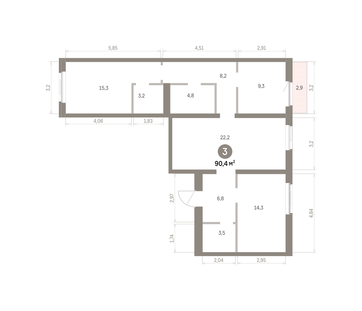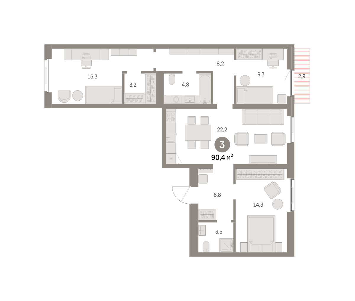 Квартира с кухней-гостиной и тремя спальнями в районе Шишимская горка. Особенности планировки: балкон, вид во двор, второй санузел, второй свет, гардеробная, окна на две стороны, предчистовая отделка, разнесённые спальни.