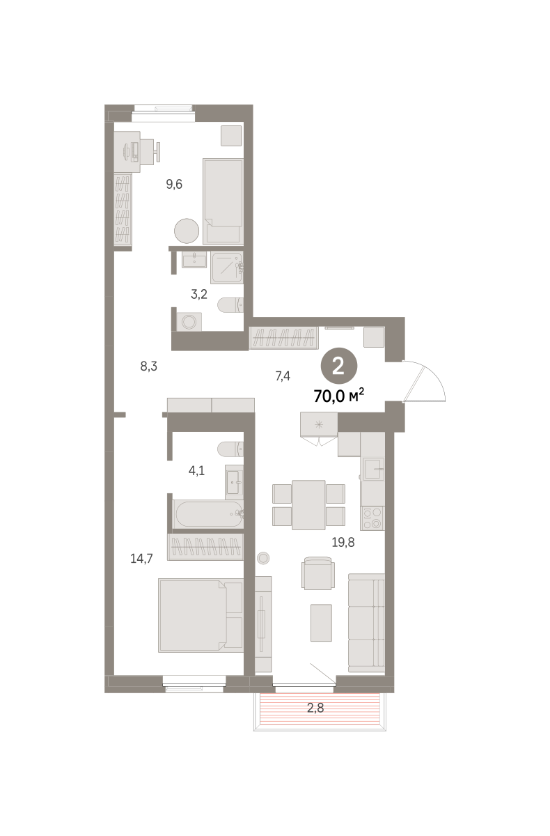 Квартира с кухней-гостиной и двумя спальнями в районе Шишимская горка. Особенности планировки: балкон, вид во двор, второй свет, гардеробная, мастер-спальня, окна на две стороны, предчистовая отделка, разнесённые спальни.
