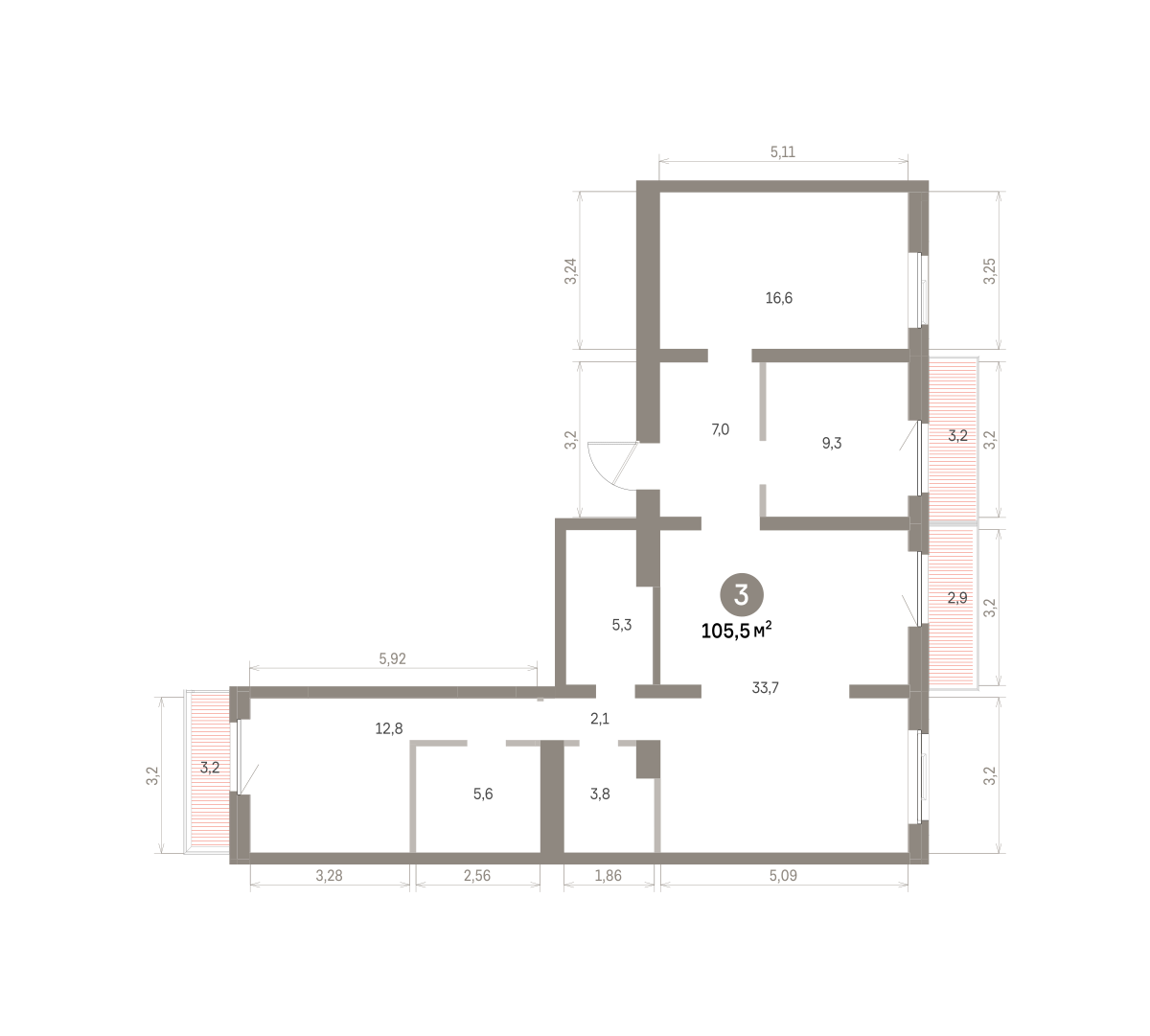Квартира с кухней-гостиной и тремя спальнями в районе Шишимская горка. Особенности планировки: балкон, вид во двор, второй свет, гардеробная, мастер-спальня, окна на две стороны, постирочная, предчистовая отделка, разнесённые спальни.