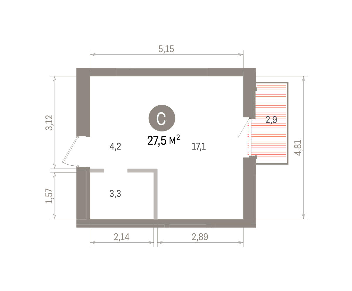Студия в квартале «Депо». Особенности планировки: балкон, вид во двор, предчистовая отделка. № квартиры в нашей базе: ДЕП07-Ж6.8.7.