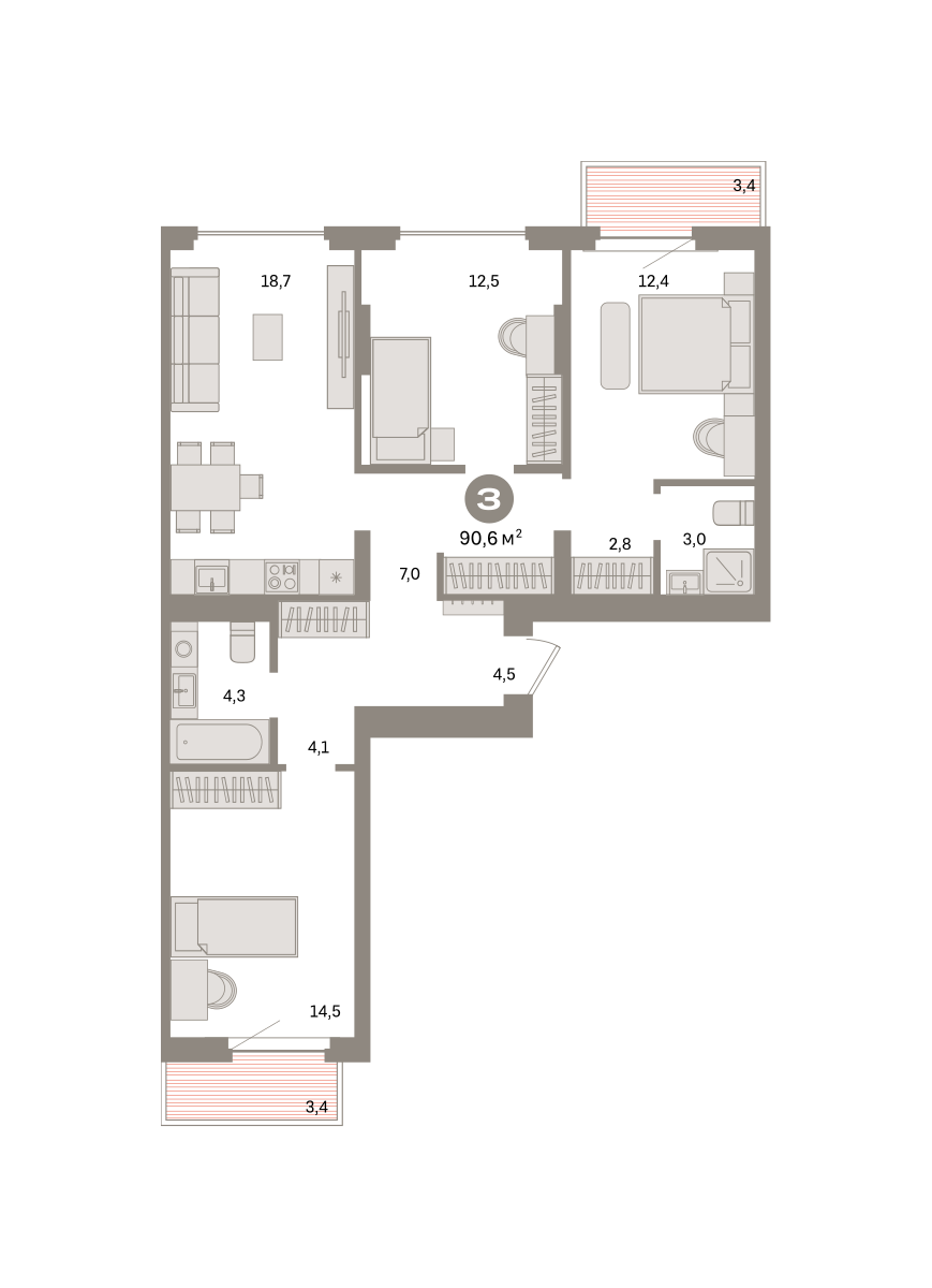 Квартира с кухней-гостиной и тремя спальнями в квартале «Депо». Особенности планировки: балкон, вид во двор, гардеробная, мастер-спальня, окна на две стороны, предчистовая отделка, разнесённые спальни.