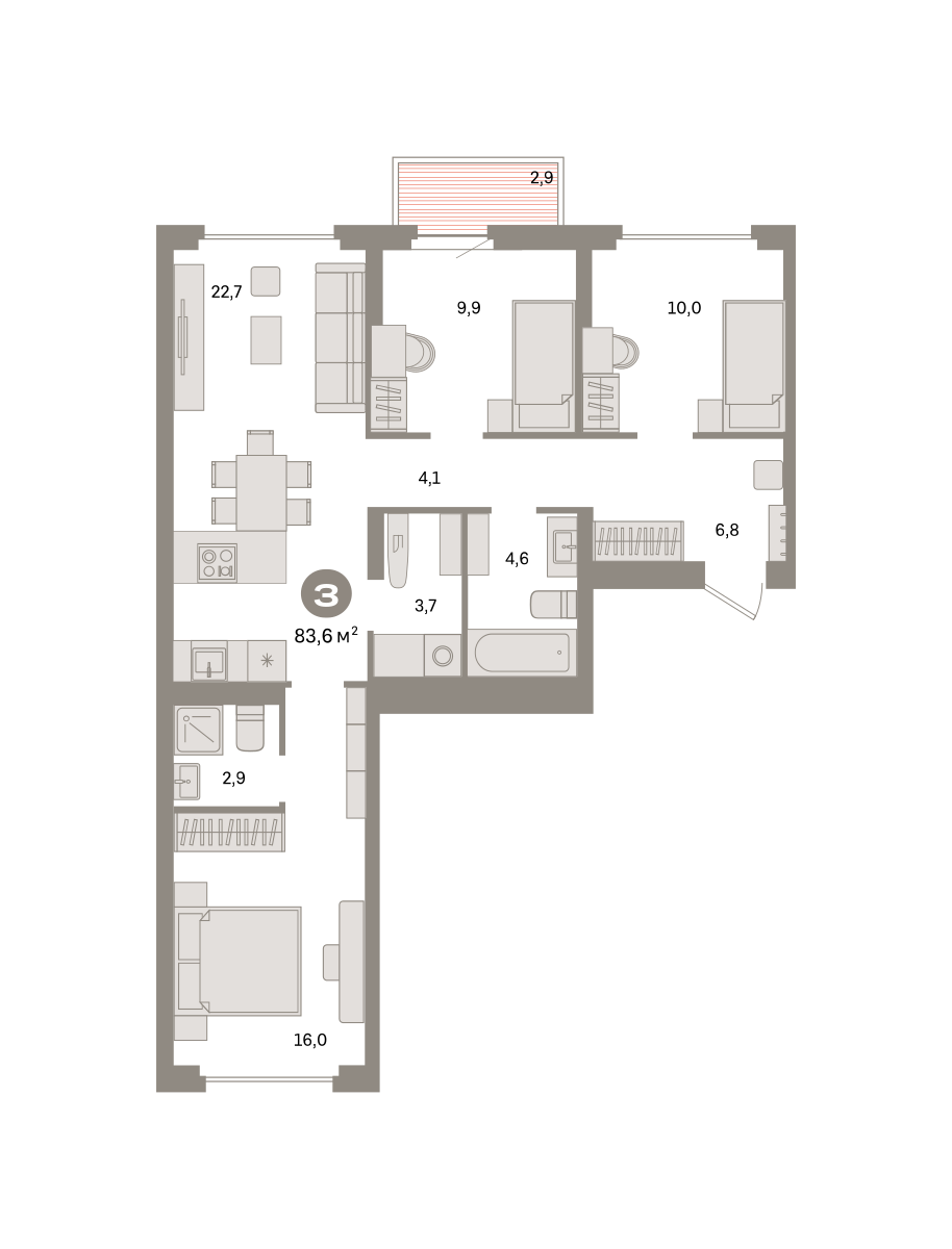 Квартира с кухней-гостиной и тремя спальнями в квартале «Депо». Особенности планировки: балкон, вид во двор, второй санузел, мастер-спальня, окна на две стороны, постирочная, предчистовая отделка, разнесённые спальни.
