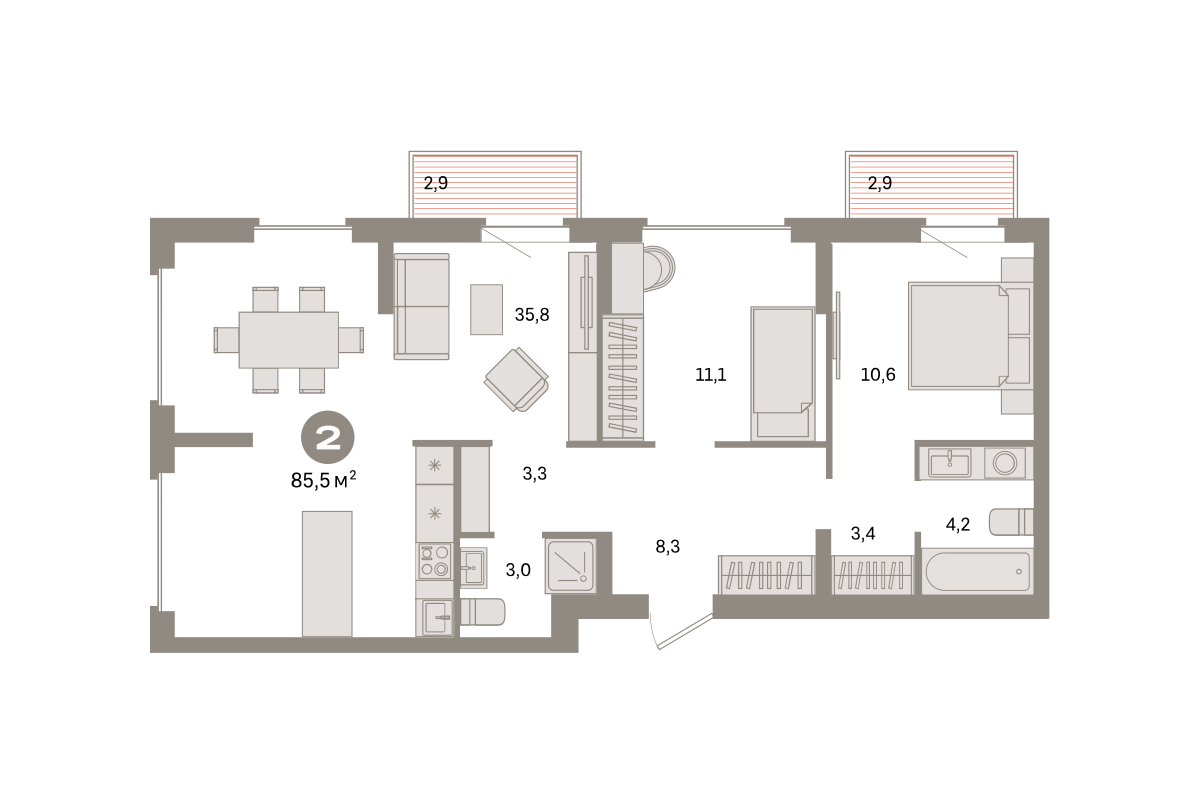 Продаётся с кладовой. Квартира с кухней-гостиной и двумя спальнями в квартале «Депо». Особенности планировки: балкон, второй санузел, гардеробная, мастер-спальня, предчистовая отделка, рабочий кабинет. № квартиры в нашей базе: ДЕП04-Ж1.7.6.