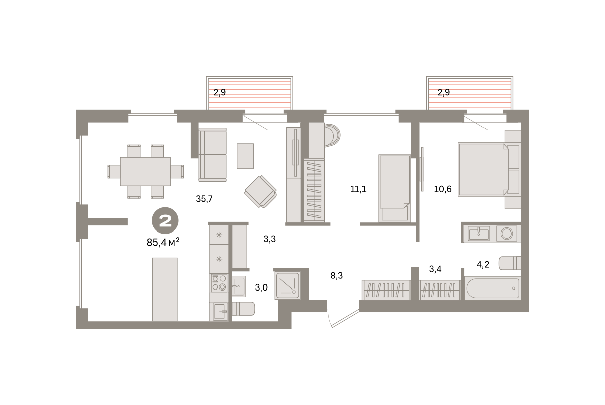 Продаётся с кладовой. Квартира с кухней-гостиной и двумя спальнями в квартале «Депо». Особенности планировки: балкон, второй санузел, гардеробная, мастер-спальня, предчистовая отделка, рабочий кабинет. № квартиры в нашей базе: ДЕП04-Ж1.4.6.