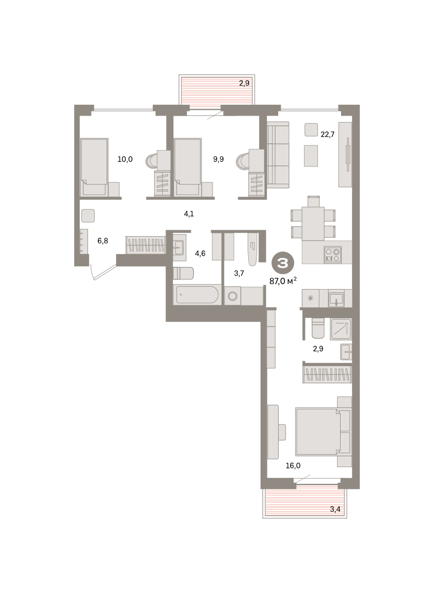 Квартира с кухней-гостиной и тремя спальнями в квартале «Депо». Особенности планировки: балкон, вид во двор, второй санузел, мастер-спальня, окна на две стороны, постирочная, предчистовая отделка, разнесённые спальни.