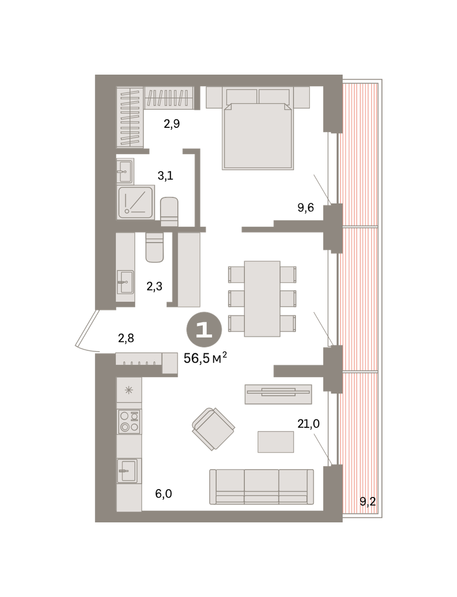Квартира с кухней-гостиной и одной спальней в квартале «Депо». Особенности планировки: гардеробная, мастер-спальня, предчистовая отделка, терраса на крыше. № квартиры в нашей базе: ДЕП07-Ж3.7.4.