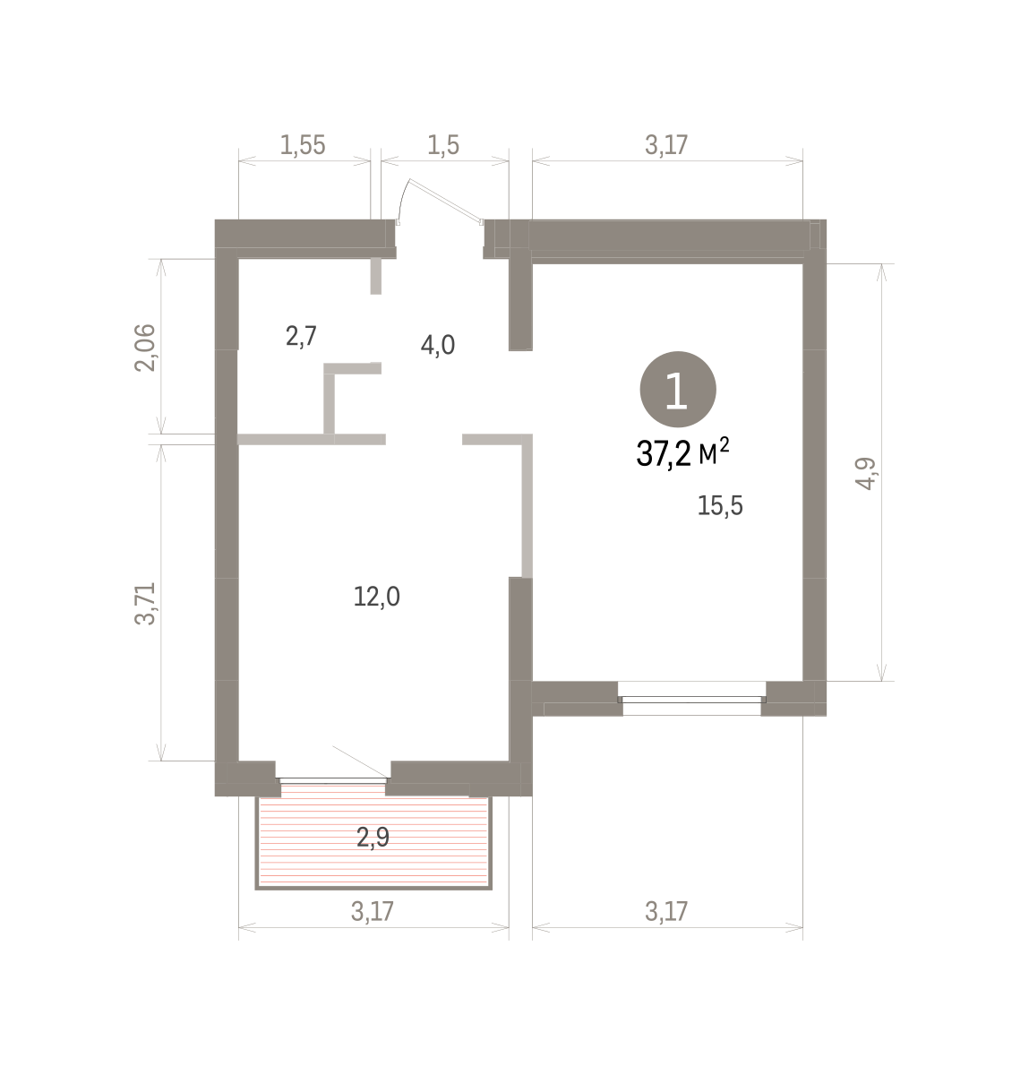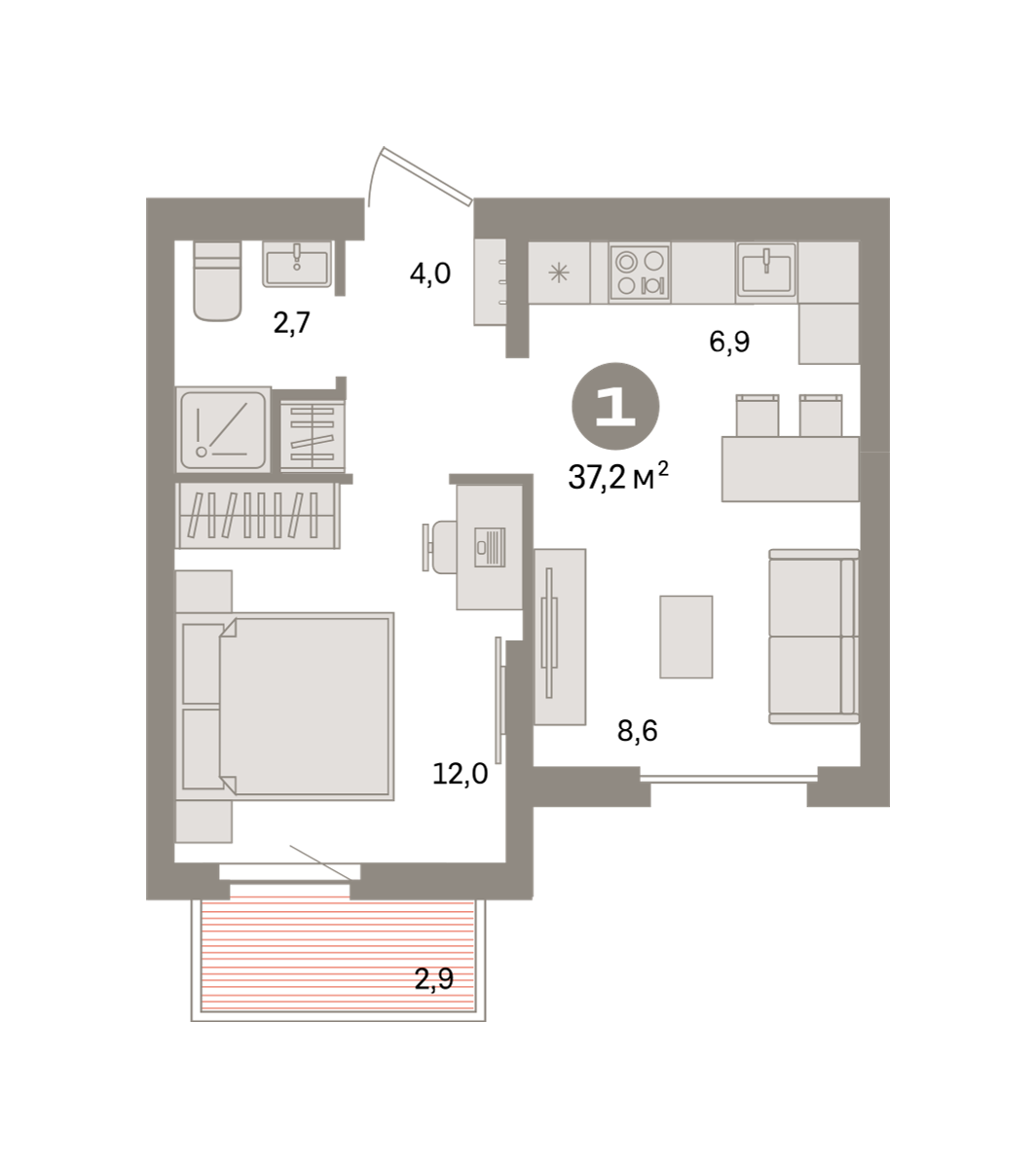 Квартира с кухней-гостиной и одной спальней в квартале «Депо». Особенности планировки: балкон, предчистовая отделка. № квартиры в нашей базе: ДЕП07-Ж5.3.2.