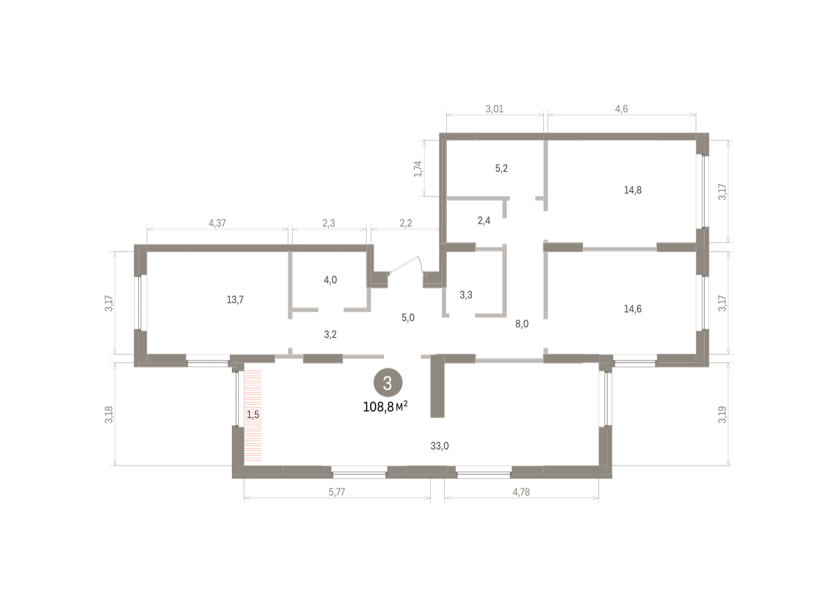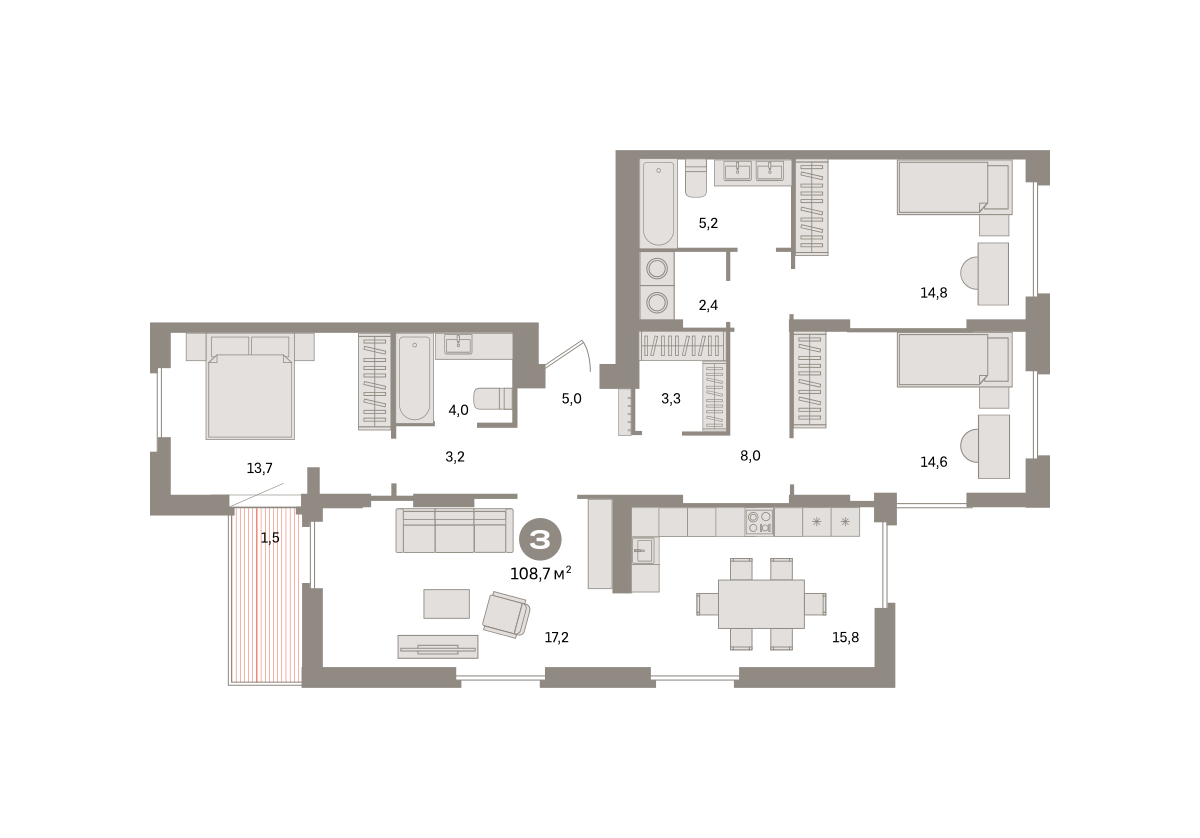 Квартира с кухней-гостиной и тремя спальнями в квартале «Депо». Особенности планировки: вид во двор, второй санузел, гардеробная, лоджия, постирочная, предчистовая отделка, разнесённые спальни. № квартиры в нашей базе: ДЕП07-Ж1.16.2.