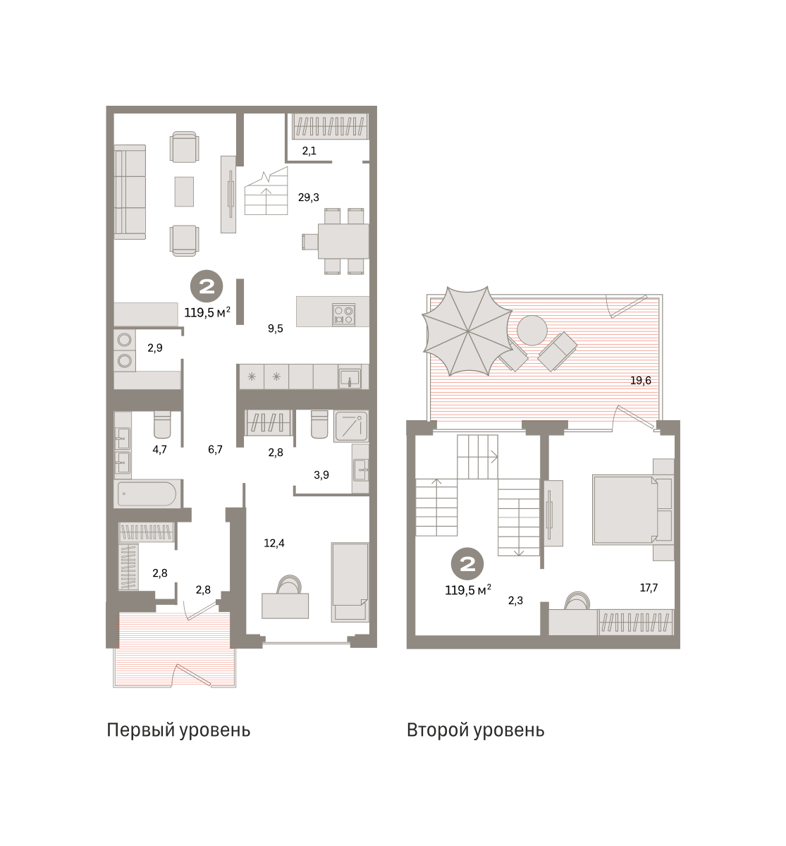 Двухуровневая квартира с кухней-гостиной и двумя спальнями в квартале «Депо». Особенности планировки: вид во двор, гардеробная, двухуровневая, мастер-спальня, окна в пол, окна на две стороны, отдельный вход, панорамное остекление, постирочная, потолки 3 м и выше, предчистовая отделка, разнесённые спальни, терраса.