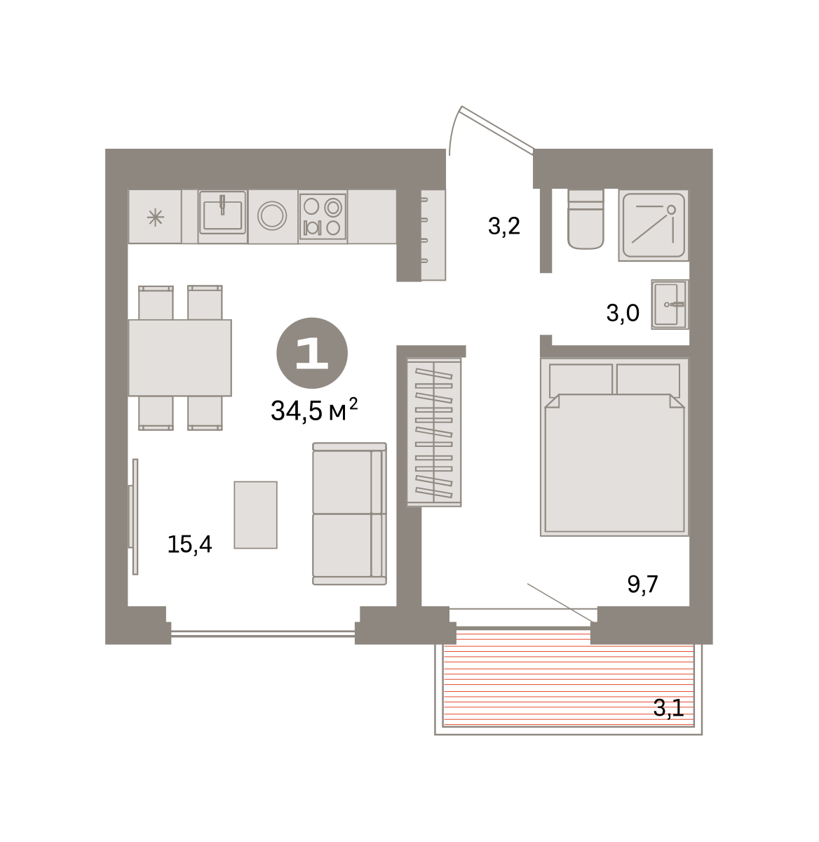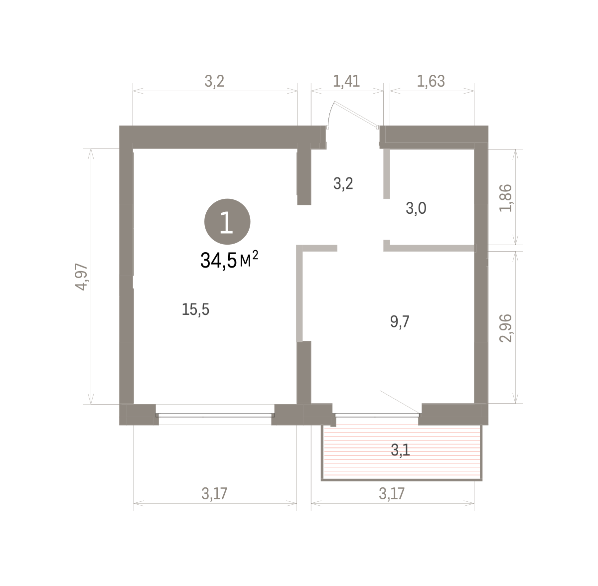 Квартира с кухней-гостиной и одной спальней в квартале «Депо». Особенности планировки: балкон, предчистовая отделка. № квартиры в нашей базе: ДЕП07-Ж6.9.3.