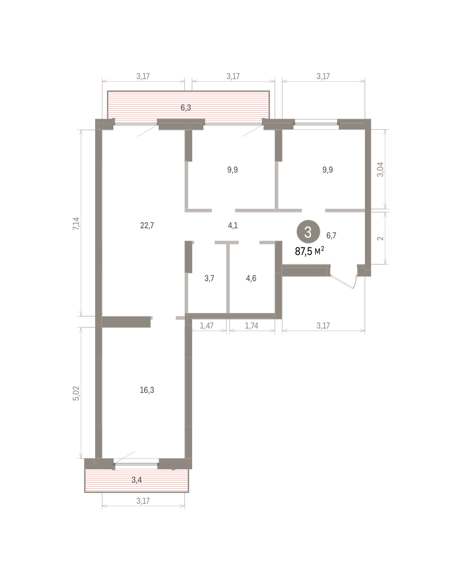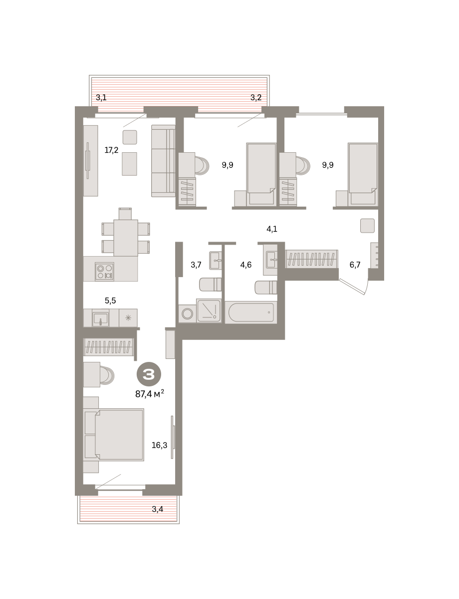 Квартира с кухней-гостиной и тремя спальнями в квартале «Депо». Особенности планировки: балкон, вид во двор, второй санузел, окна на две стороны, предчистовая отделка, разнесённые спальни, терраса на крыше.