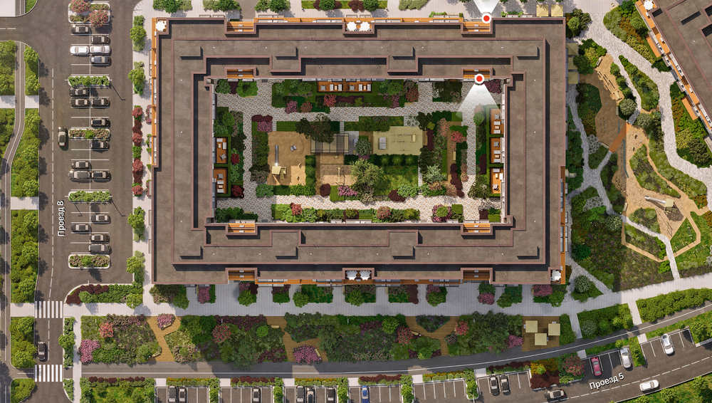Квартира с кухней-гостиной и тремя спальнями в Бруснике в Академическом. Особенности планировки: вид во двор, второй санузел, гардеробная, мастер-спальня, постирочная, предчистовая отделка, разнесённые спальни, терраса на крыше.