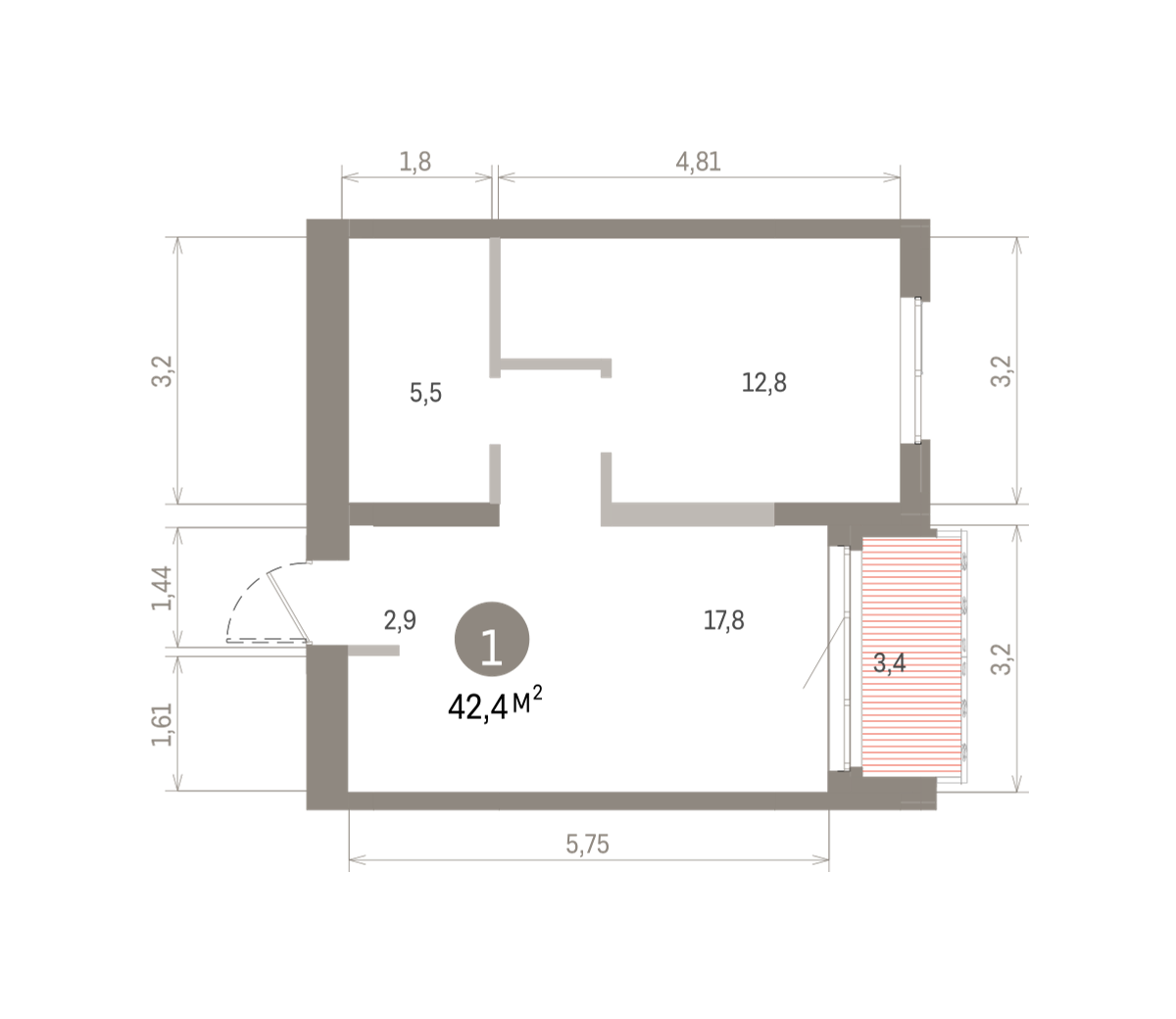 Квартира с кухней-гостиной и одной спальней в Южных кварталах. Особенности планировки: предчистовая отделка, терраса.
