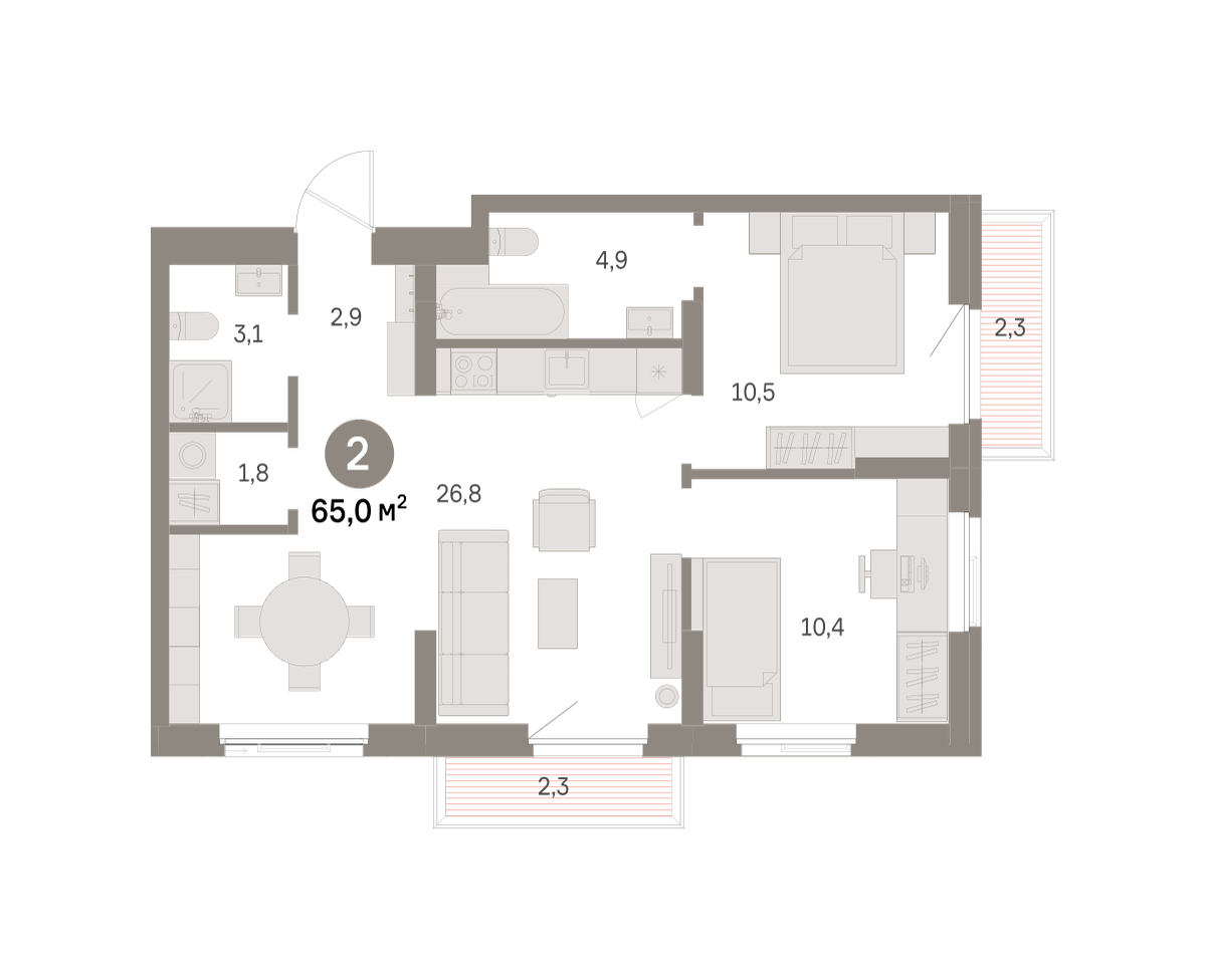 Квартира с кухней-гостиной и двумя спальнями в районе Шишимская горка. Особенности планировки: балкон, мастер-спальня, постирочная, предчистовая отделка, разнесённые спальни, стартовая цена.