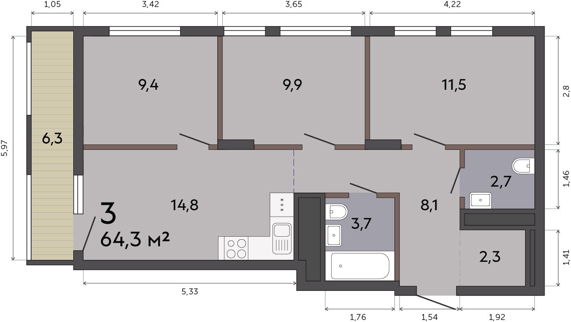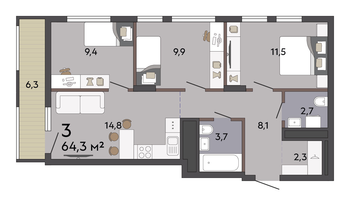 64.30 м² | 3 - 19 эт.