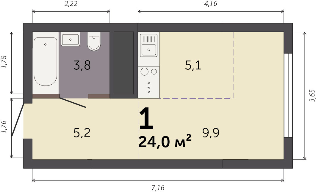 22.20 м² | 22 - 25 эт.