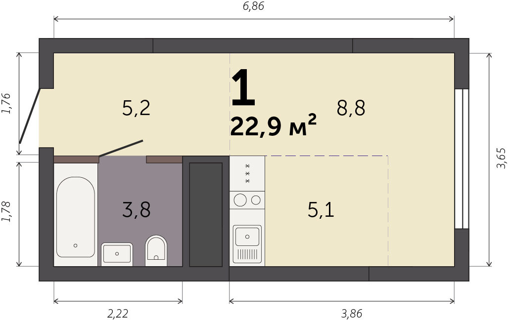 22.20 м² | 22 - 25 эт.