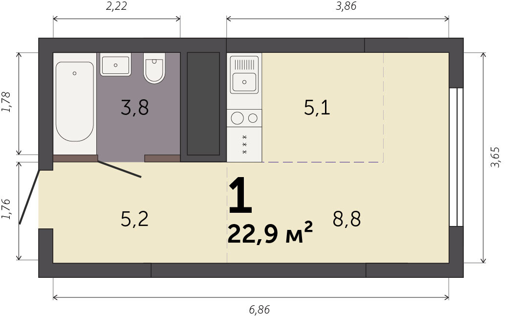 22.20 м² | 22 - 25 эт.