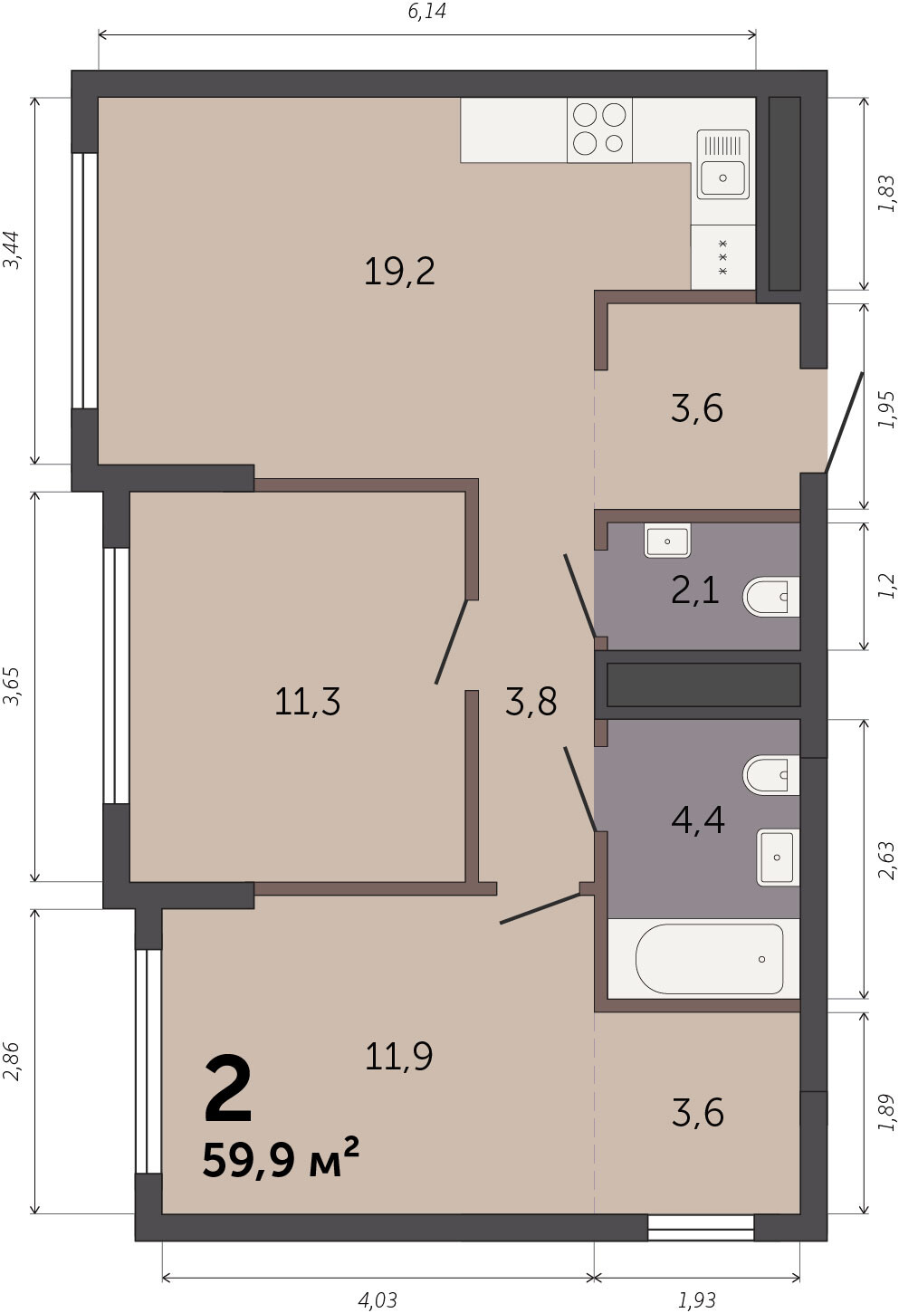 61.30 м² | 2 - 19 эт.