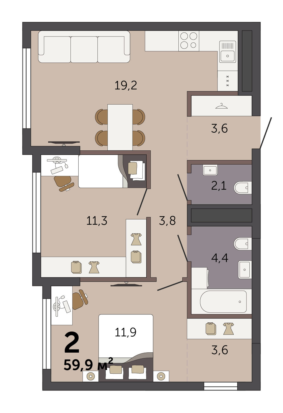 59.70 м² | 12 - 19 эт.