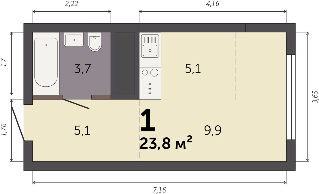 22.20 м² | 22 - 25 эт.