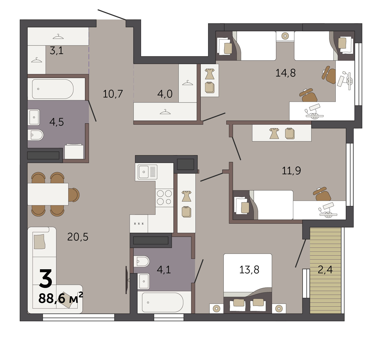 3-к квартира | 88.80 м² | 7 - 29 эт.