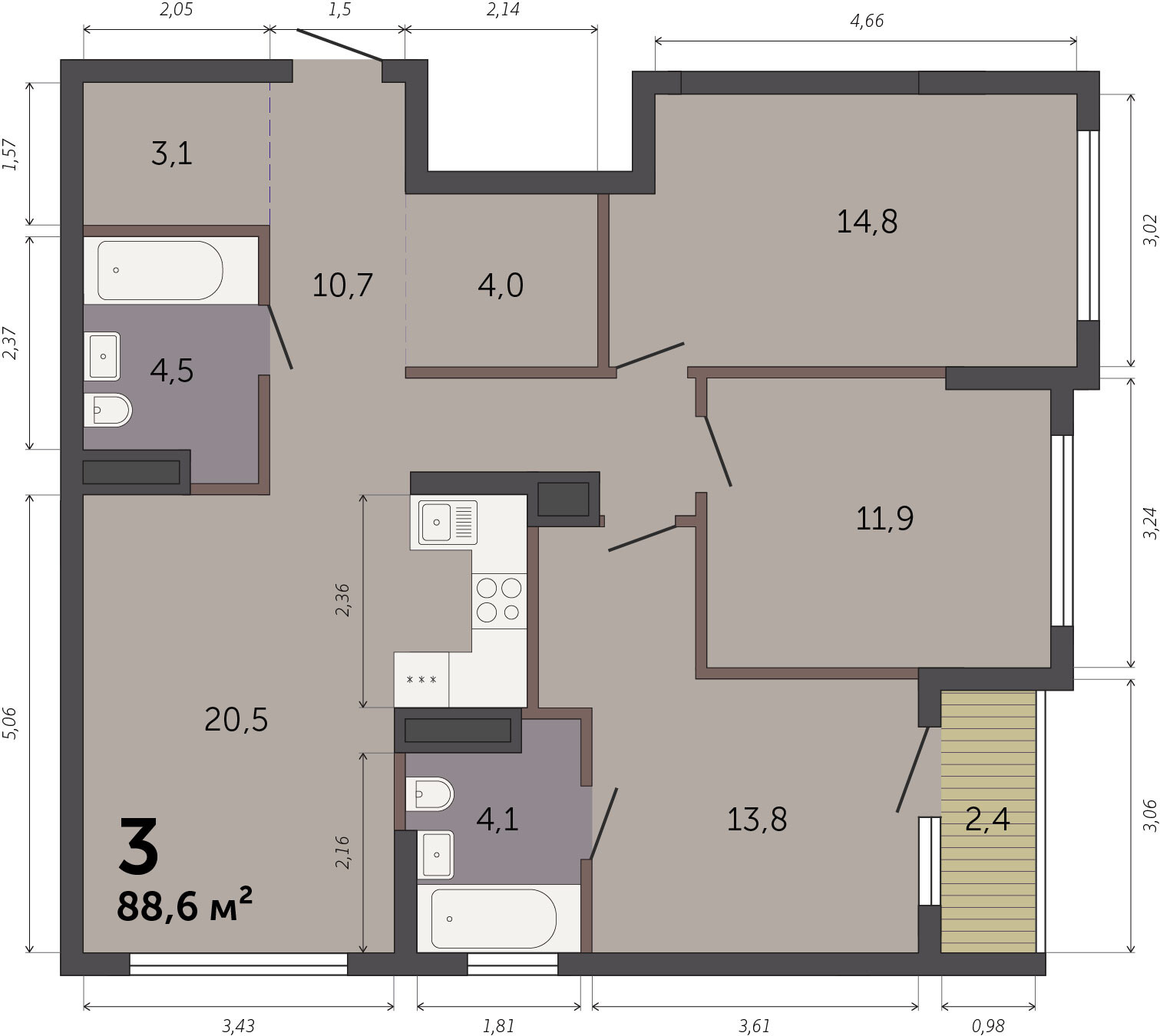 3-к квартира | 88.80 м² | 7 - 29 эт.