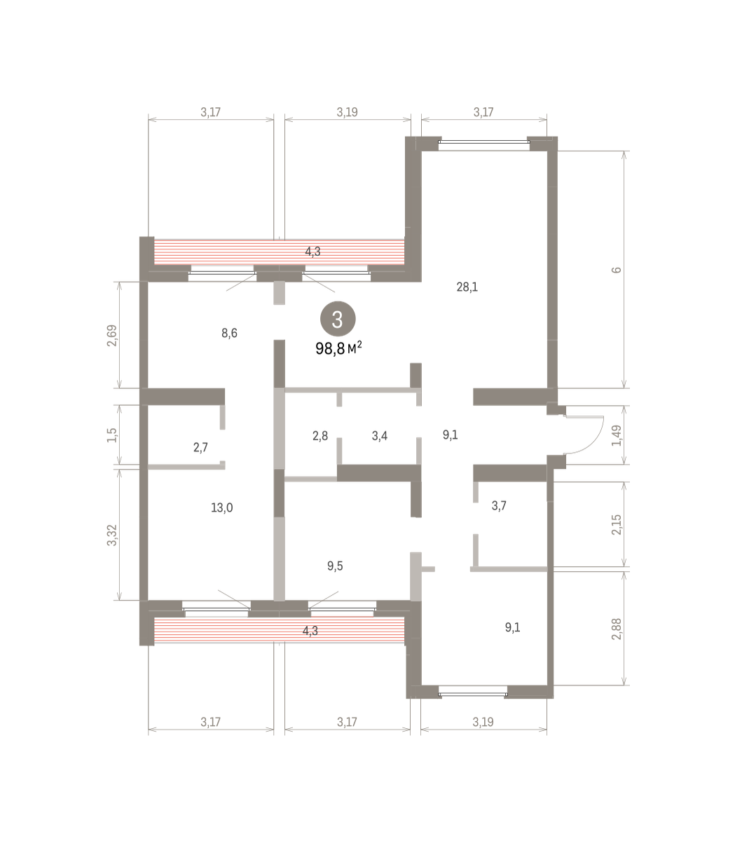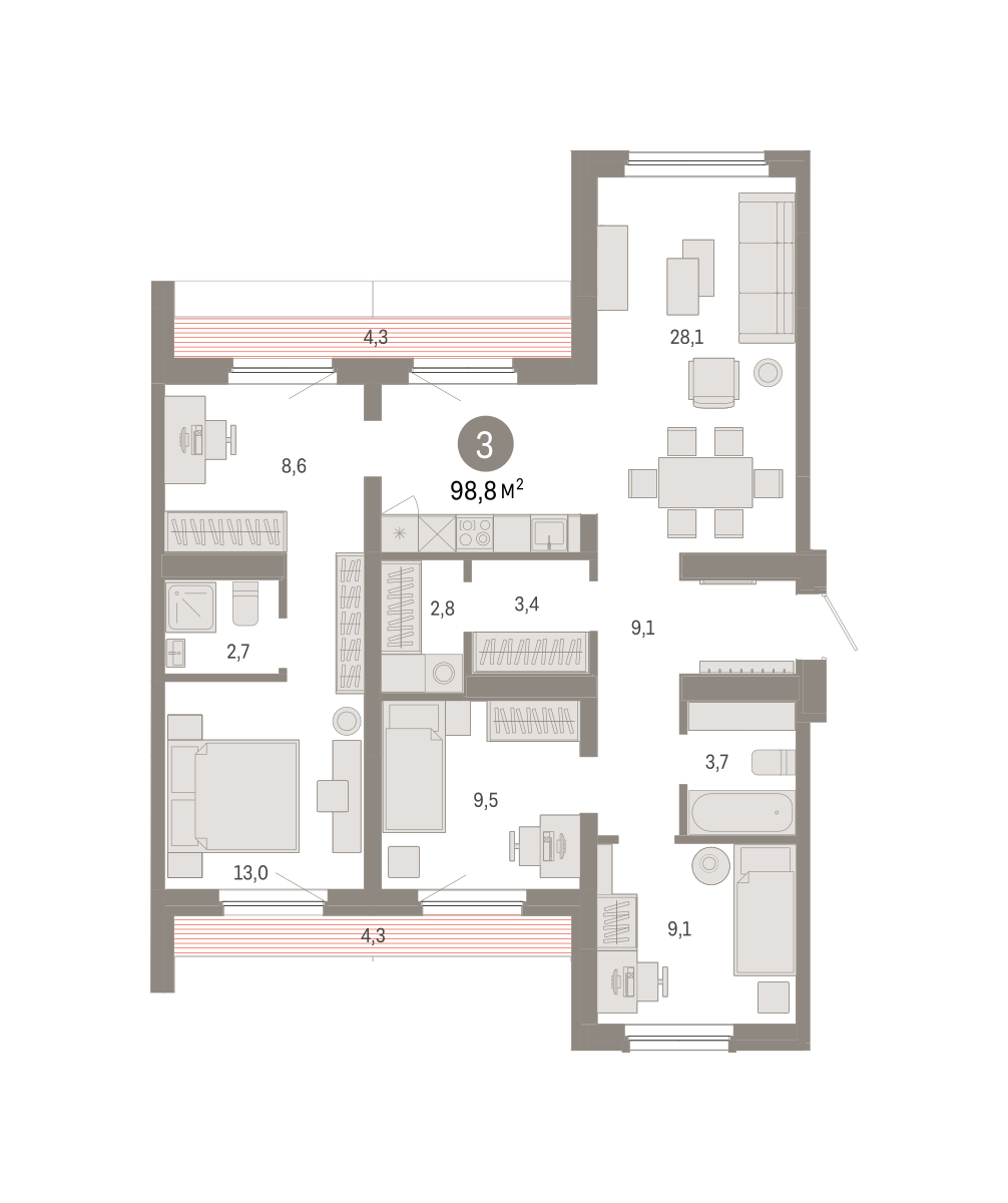 Квартира с кухней-гостиной и тремя спальнями в Бруснике в Академическом. Особенности планировки: вид во двор, второй санузел, гардеробная, мастер-спальня, постирочная, предчистовая отделка, разнесённые спальни, терраса на крыше.