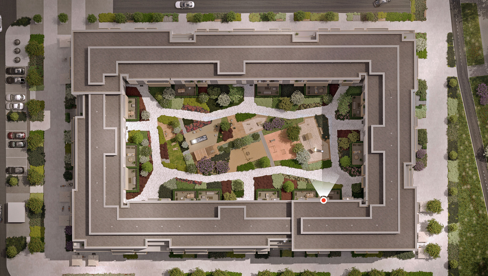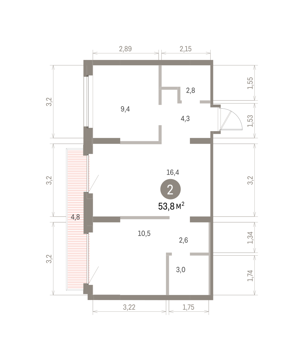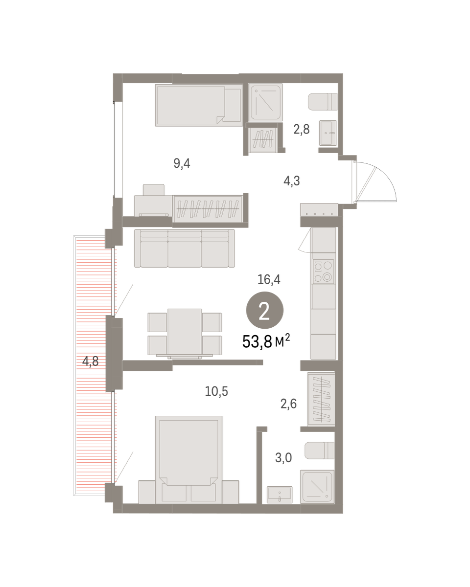 Квартира с кухней-гостиной и двумя спальнями в Бруснике в Академическом. Особенности планировки: балкон, вид во двор, гардеробная, двойная выгода, мастер-спальня, предчистовая отделка, разнесённые спальни.