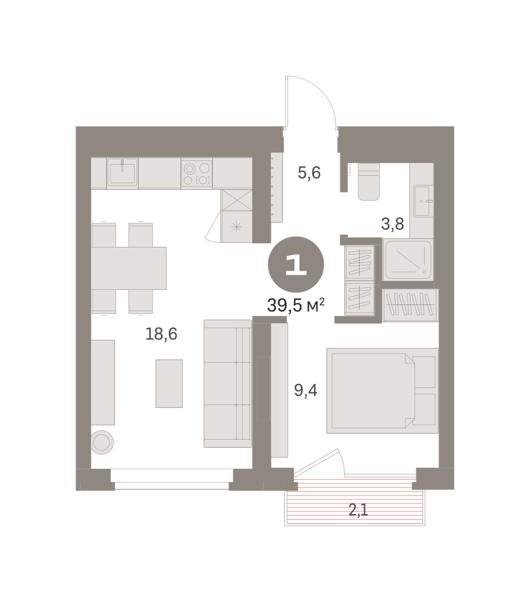 Квартира с кухней-гостиной и одной спальней в Бруснике в Академическом. Особенности планировки: балкон, предчистовая отделка. № квартиры в нашей базе: АКД04-Ж3.2.4.