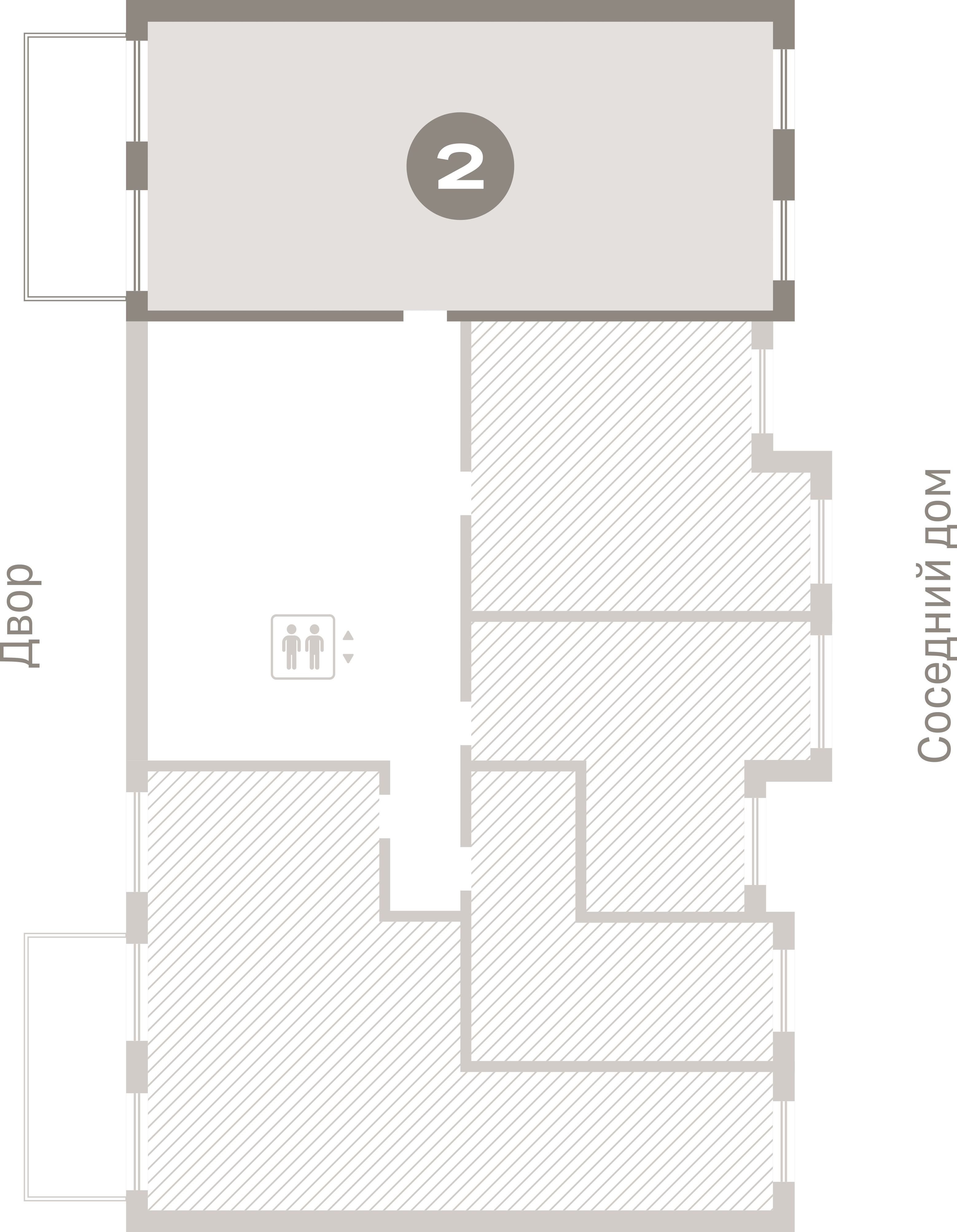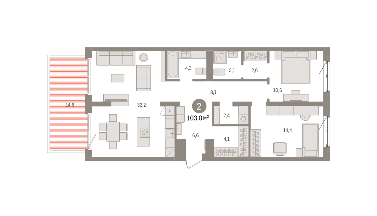 Квартира с кухней-гостиной и двумя спальнями в Южных кварталах. Особенности планировки: вид во двор, гардеробная, мастер-спальня, окна на две стороны, постирочная, потолки 3 м и выше, предчистовая отделка, разнесённые спальни, терраса.