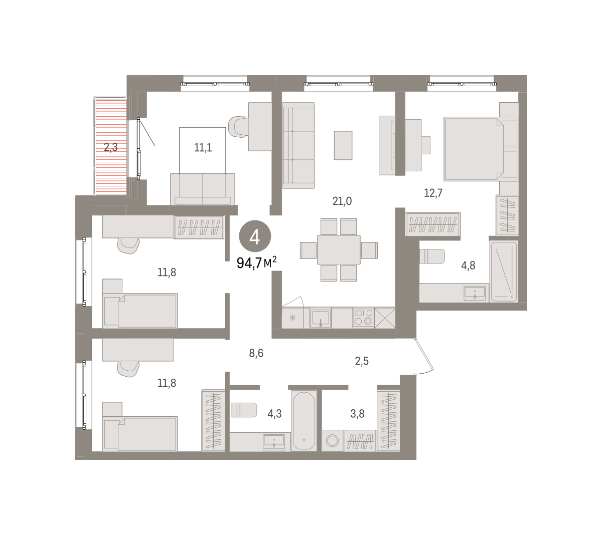 Продаётся с кладовой. Квартира с кухней-гостиной и четырьмя спальнями в Южных кварталах. Особенности планировки: балкон, гардеробная, мастер-спальня, предчистовая отделка, разнесённые спальни. № квартиры в нашей базе: ЮКВ08-Ж1.5.8.