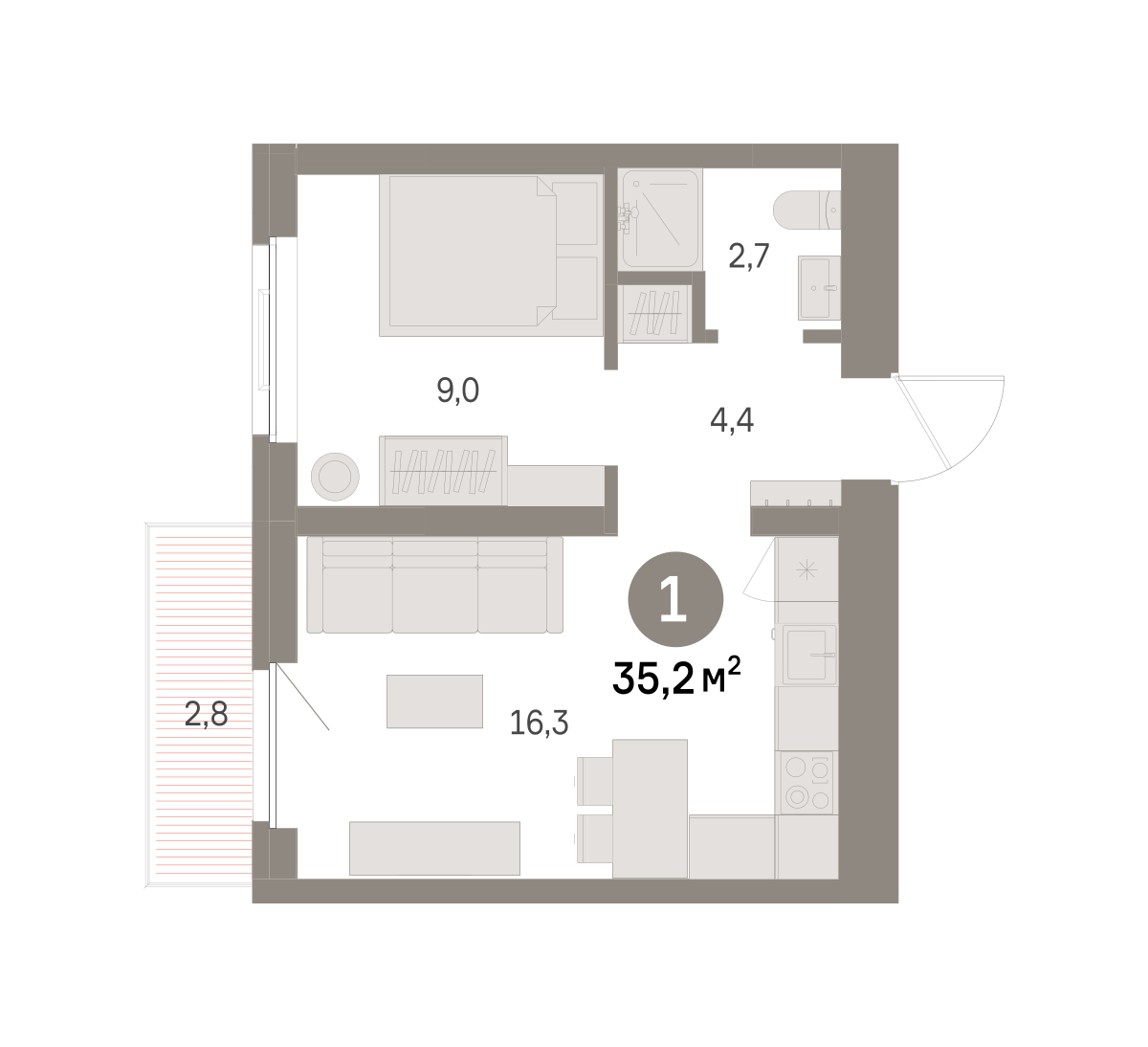 Квартира с кухней-гостиной и одной спальней в районе Шишимская горка. Особенности планировки: балкон, вид во двор, второй свет, предчистовая отделка. № квартиры в нашей базе: ШГР06-Ж1.5.1.