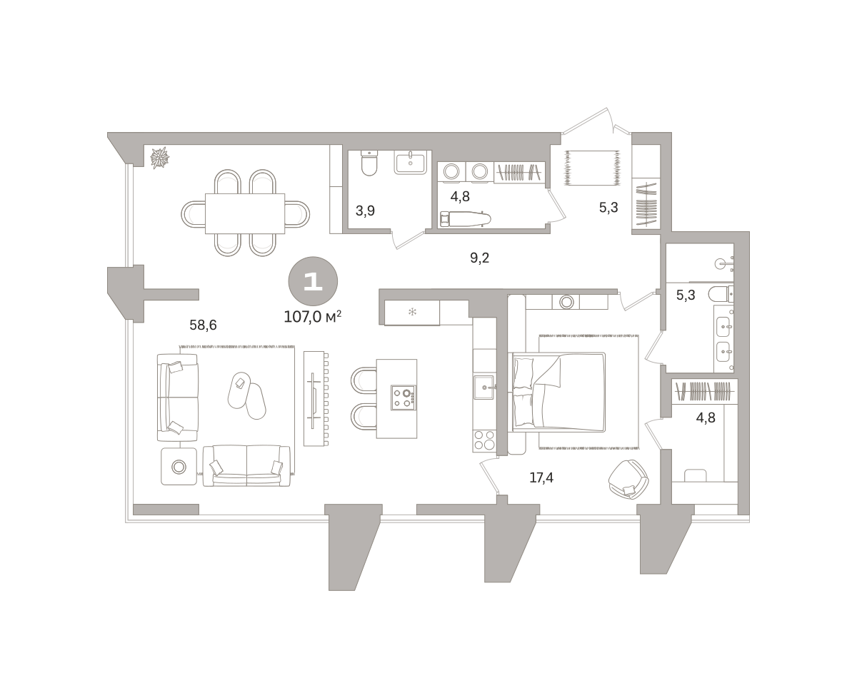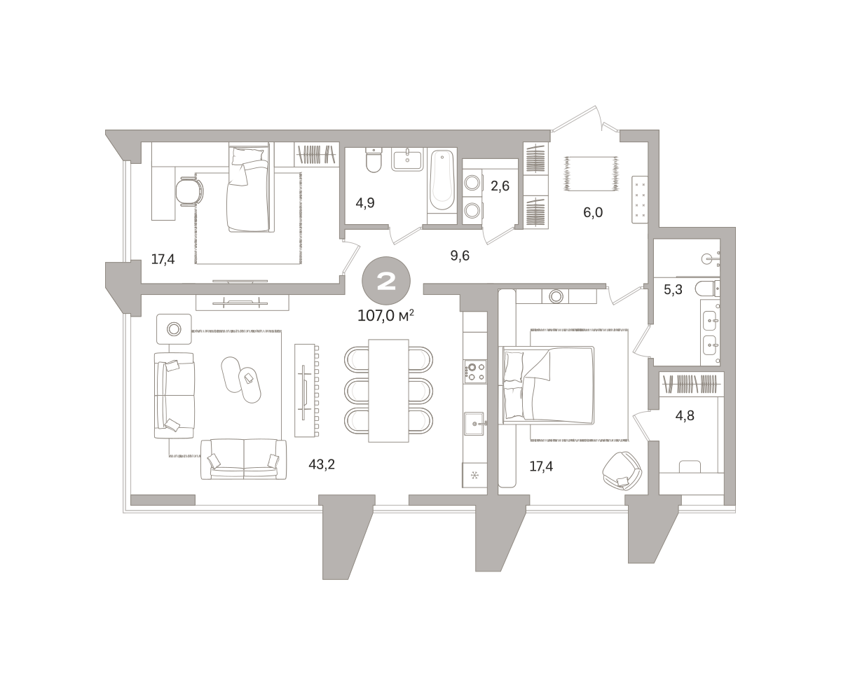 Квартира с кухней-гостиной и двумя спальнями в проекте Гоголя 21. Особенности планировки: свободная планировка. № квартиры в нашей базе: ЗНГ01-Ж2.13.5.