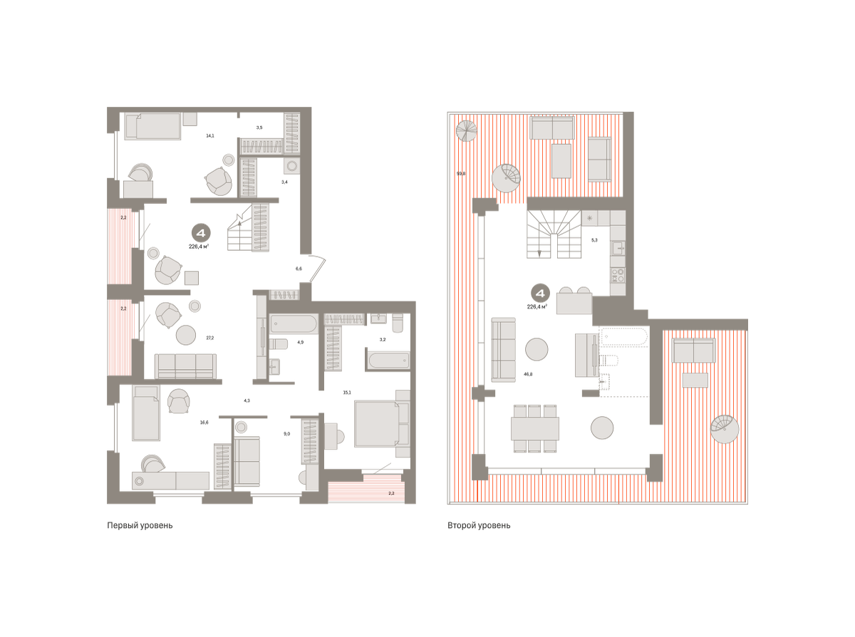 Двухуровневая квартира с кухней-гостиной и четырьмя спальнями в Южных кварталах. Особенности планировки: гардеробная, двухуровневая, летняя кухня на крыше, лоджия, мастер-спальня, постирочная, предчистовая отделка, разнесённые спальни, терраса на крыше.