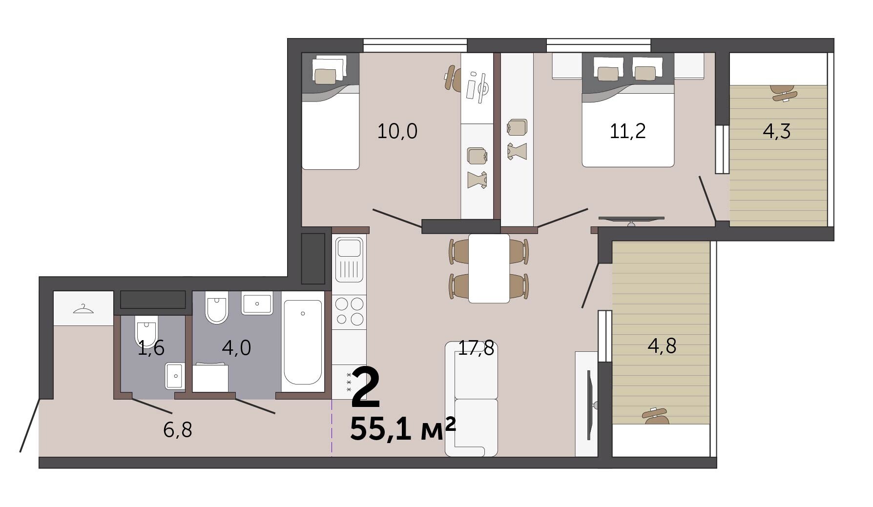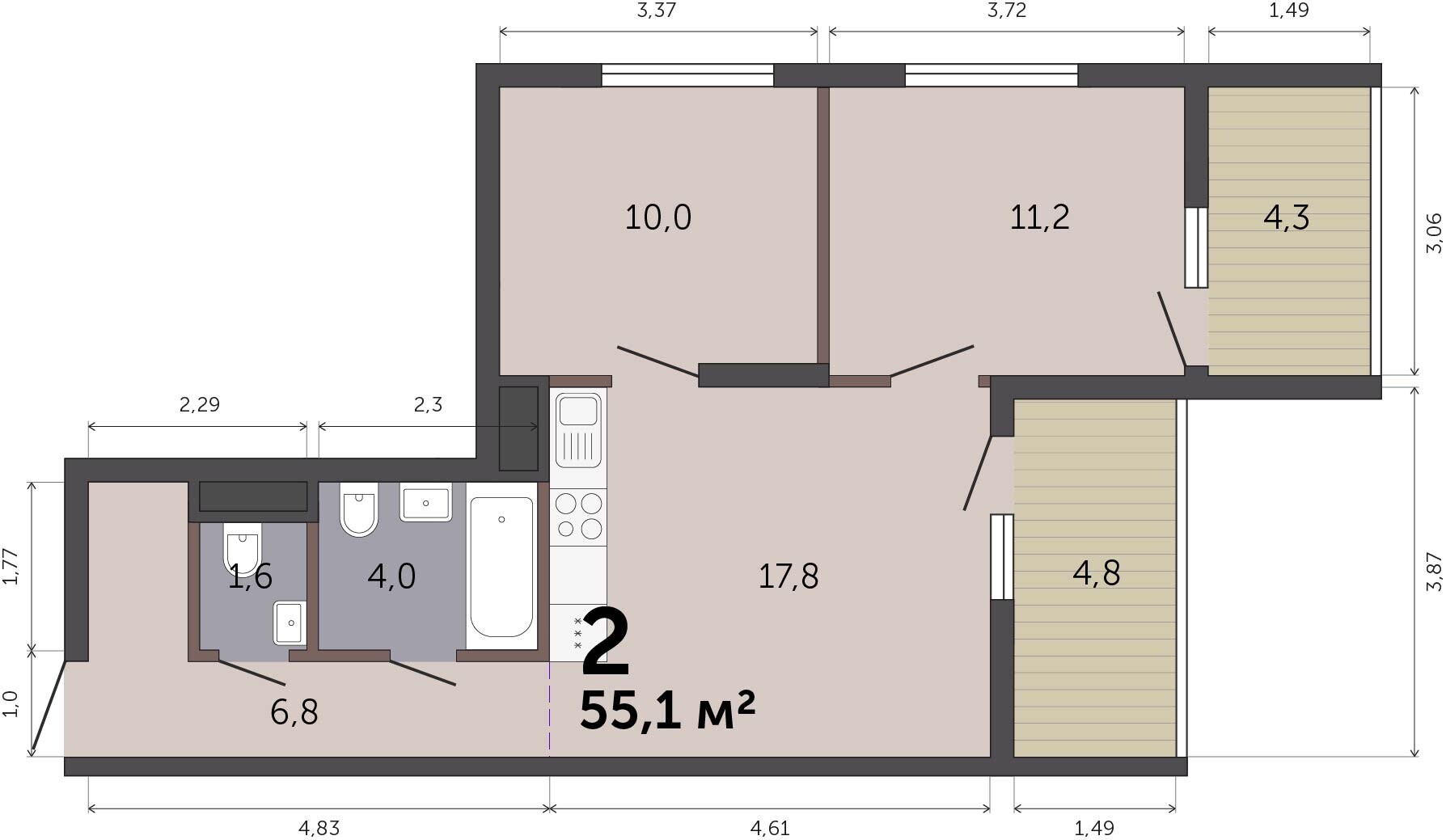 55.10 м² | 16 - 19 эт.
