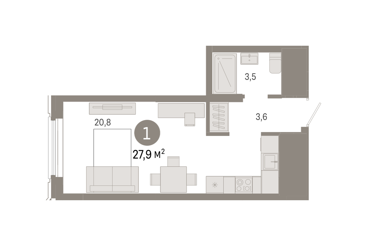 Продаётся с кладовой. Студия в квартале «На Некрасова». Особенности планировки: предчистовая отделка. № квартиры в нашей базе: НКР02-Ж1.10.2.