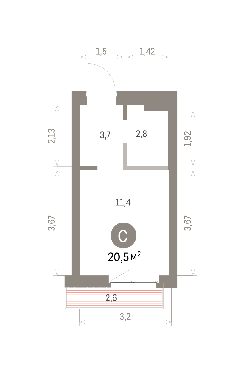 Студия в Бруснике в Академическом. Особенности планировки: балкон, предчистовая отделка. № квартиры в нашей базе: АКД04-Ж3.7.3.