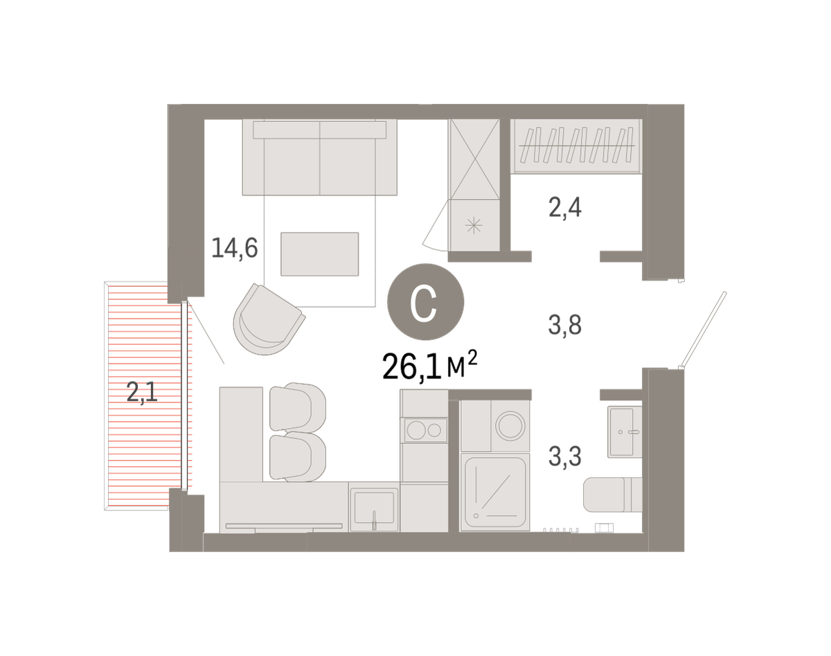 Студия в Бруснике в Академическом. Особенности планировки: балкон, вид во двор, гардеробная, двойная выгода, предчистовая отделка. № квартиры в нашей базе: АКД04-Ж1.4.9.