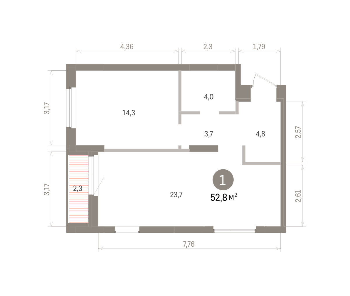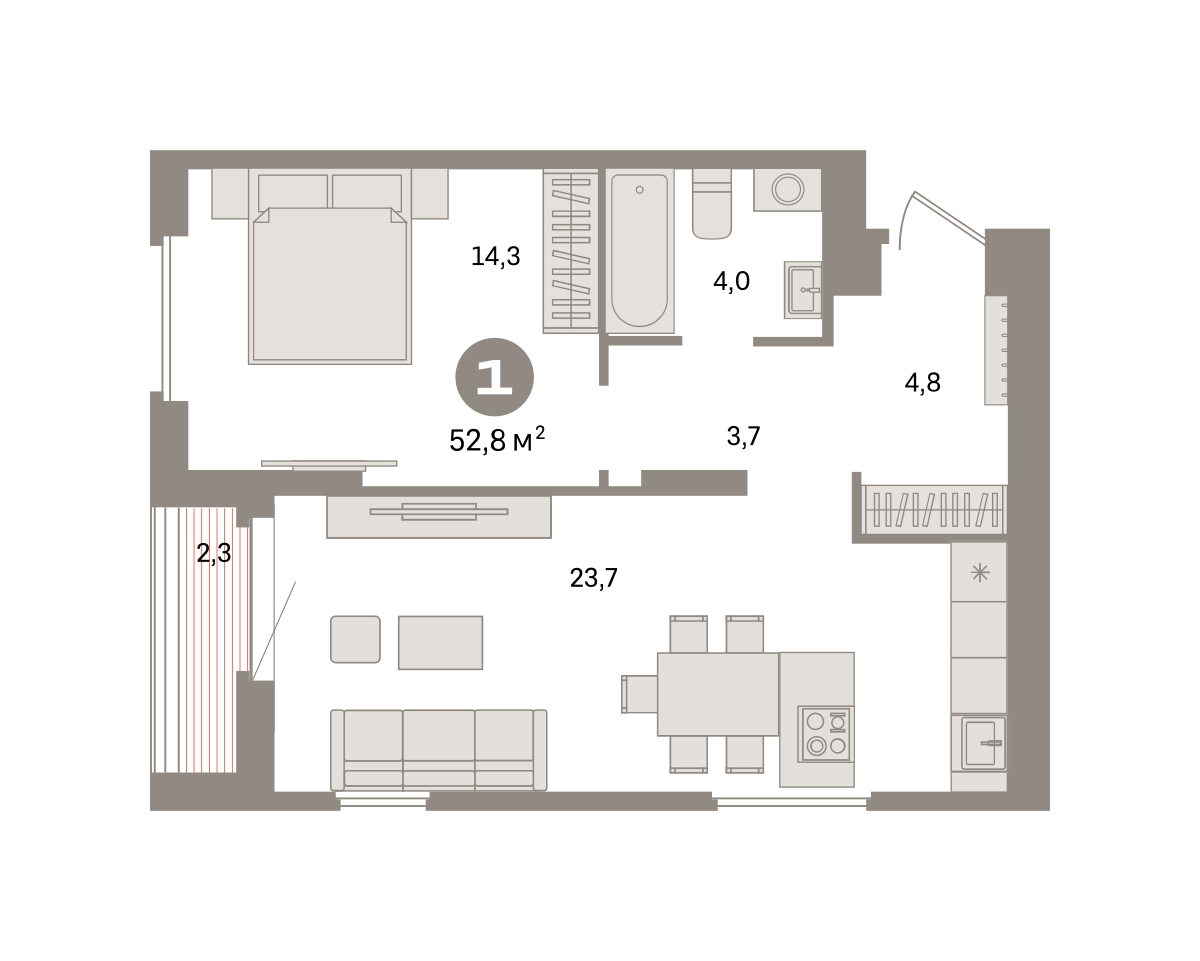 Квартира с кухней-гостиной и одной спальней в квартале «Депо». Особенности планировки: лоджия, предчистовая отделка. № квартиры в нашей базе: ДЕП07-Ж1.12.3.