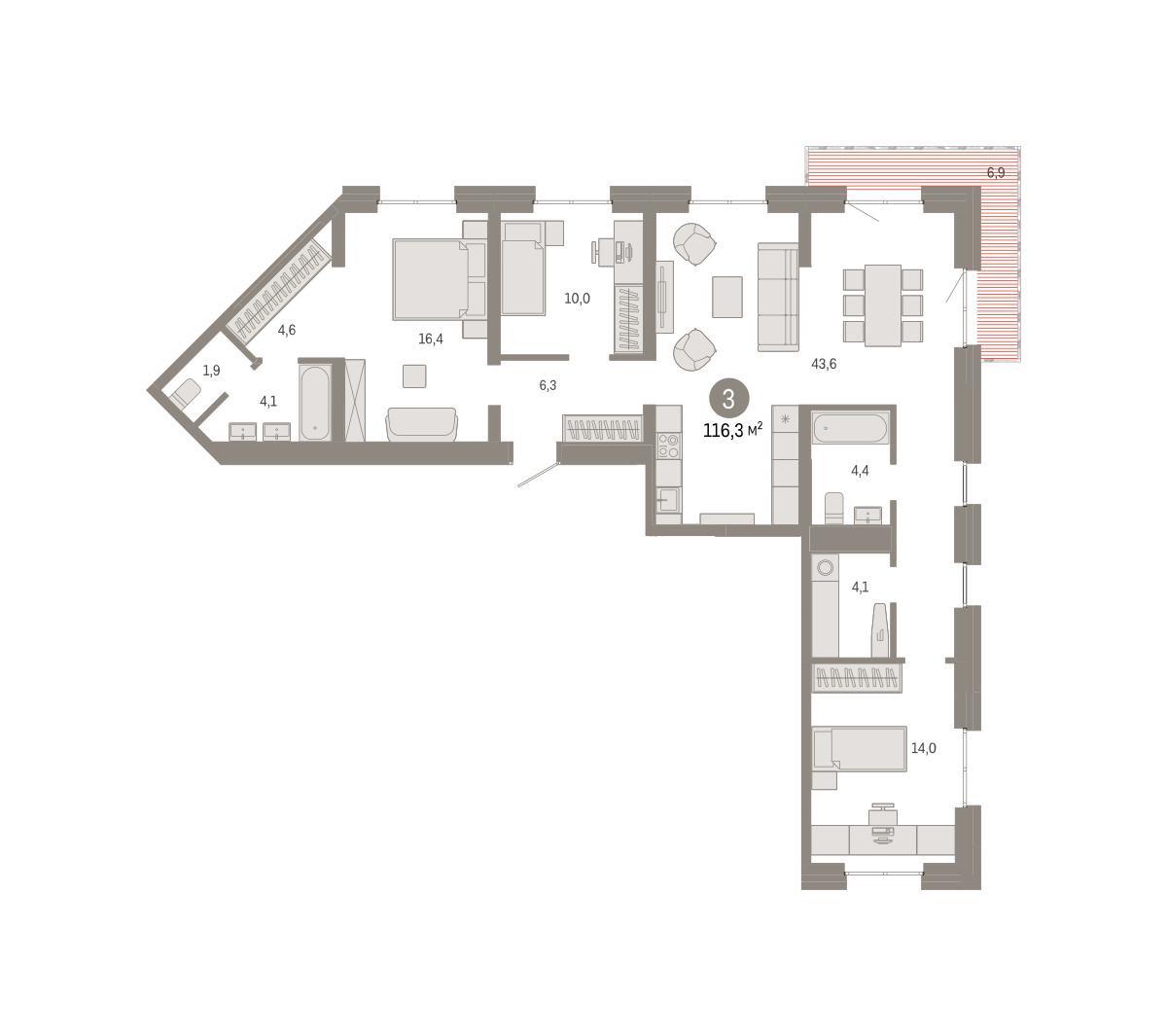 Эта трёхкомнатная квартира находится в «Южных кварталах». В ней спроектированы большая кухня-гостиная и три спальни, чтобы у каждого члена семьи было своё личное пространство. Купить трехкомнатную квартиру в районе Южного автовокзала в Екатеринбурге выгодно напрямую от застройщика Брусника.