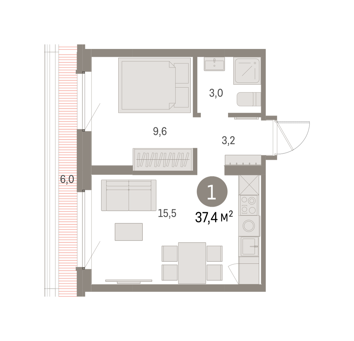 Квартира с кухней-гостиной и одной спальней в Бруснике в Академическом. Особенности планировки: предчистовая отделка, терраса на крыше. № квартиры в нашей базе: АКД05-Ж8.8.4.