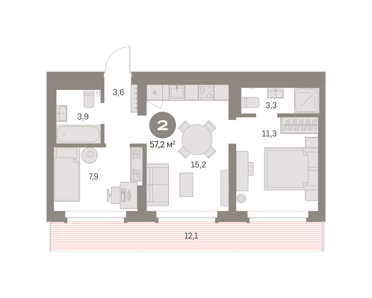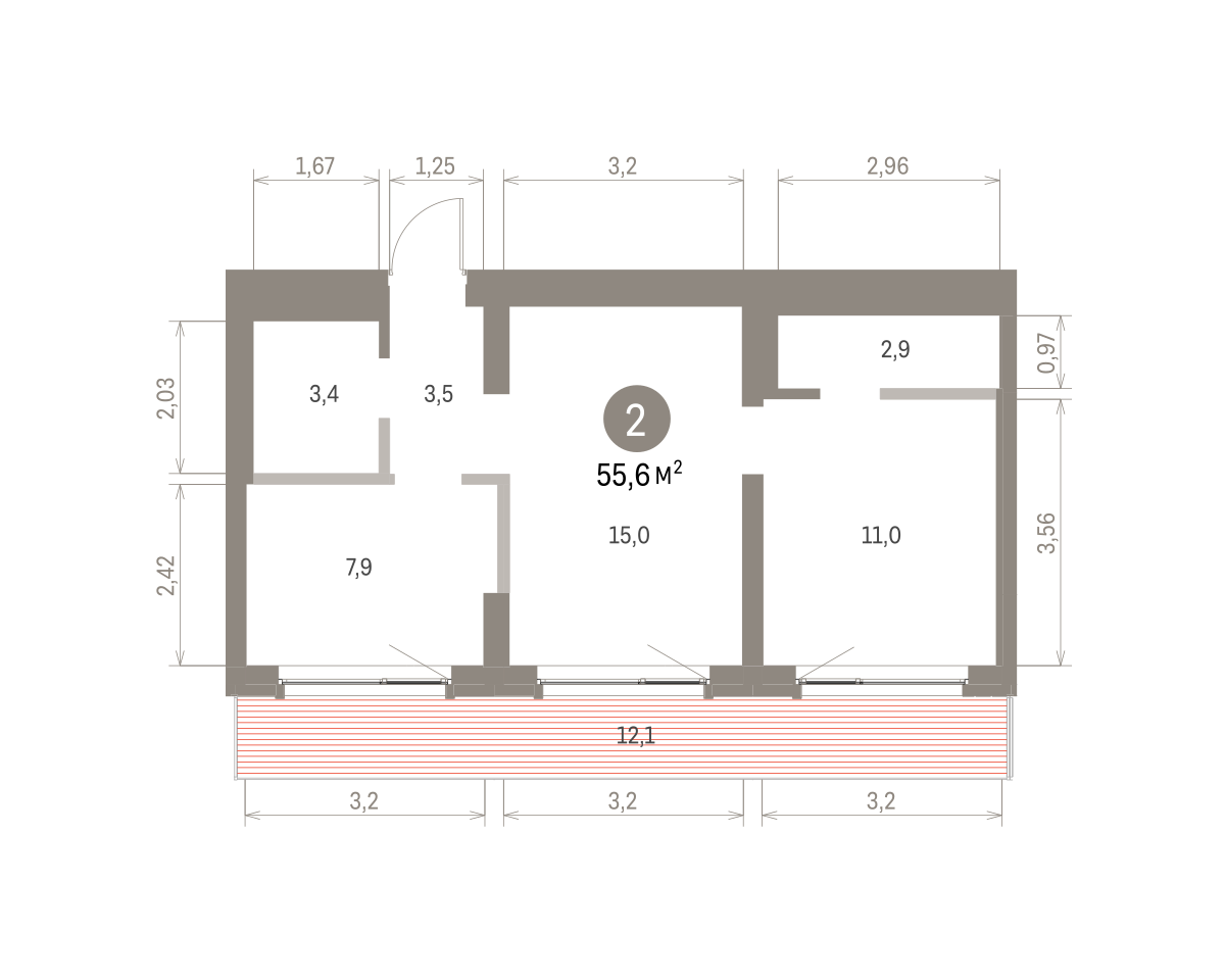 Квартира с кухней-гостиной и двумя спальнями в Бруснике в Академическом. Особенности планировки: второй санузел, мастер-спальня, предчистовая отделка, разнесённые спальни, терраса на крыше.
