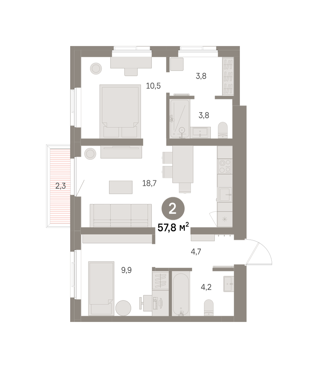 Квартира с кухней-гостиной и двумя спальнями в районе Шишимская горка. Особенности планировки: балкон, гардеробная, мастер-спальня, предчистовая отделка, разнесённые спальни, стартовая цена.