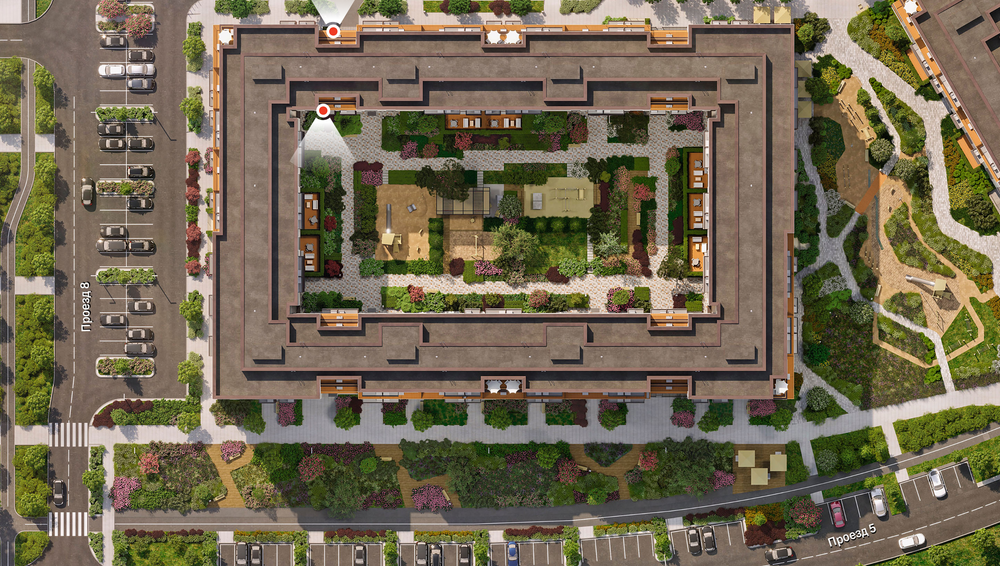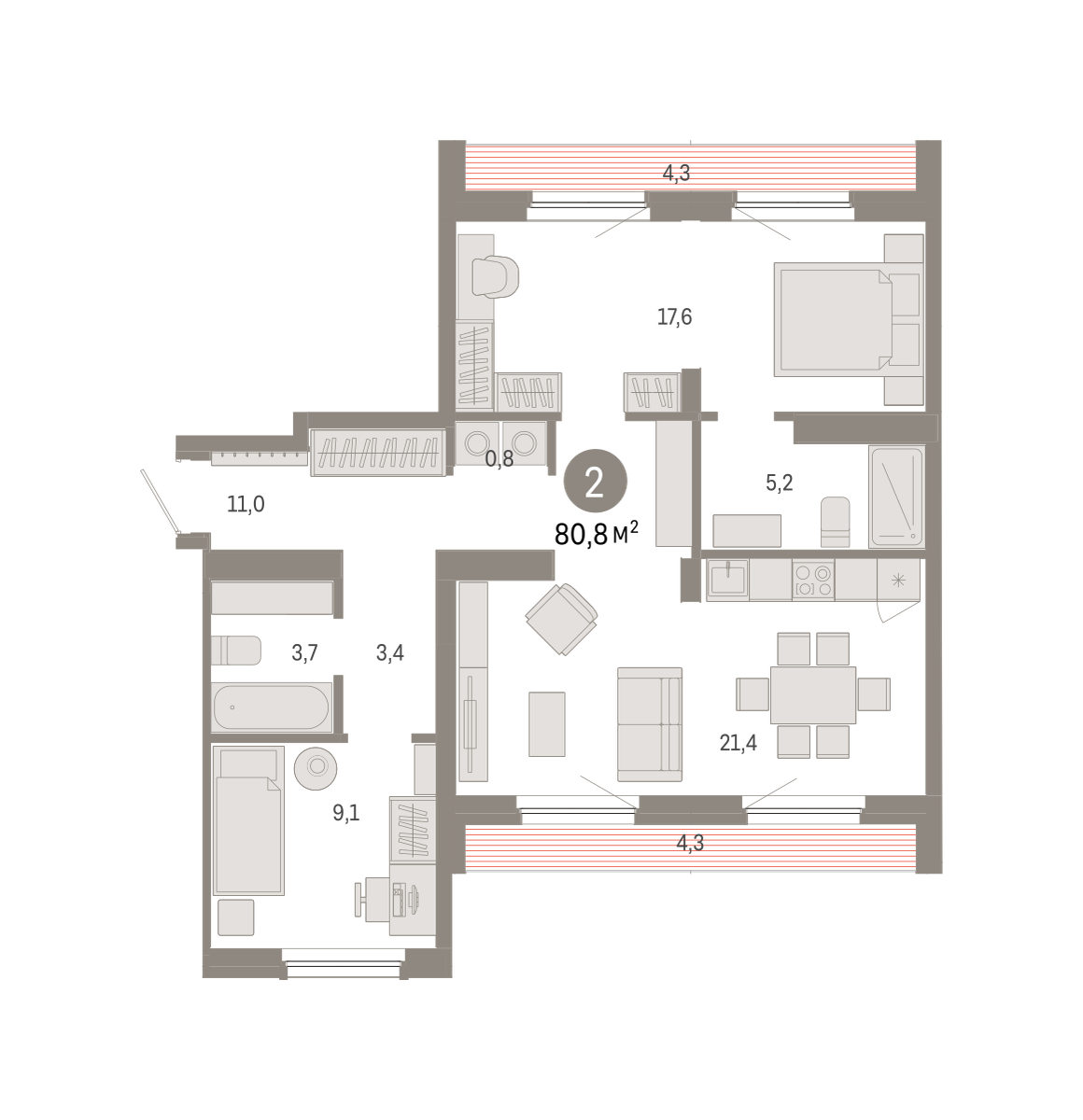 Квартира с кухней-гостиной и двумя спальнями в Бруснике в Академическом. Особенности планировки: вид во двор, второй санузел, гардеробная, мастер-спальня, предчистовая отделка, разнесённые спальни, терраса на крыше.