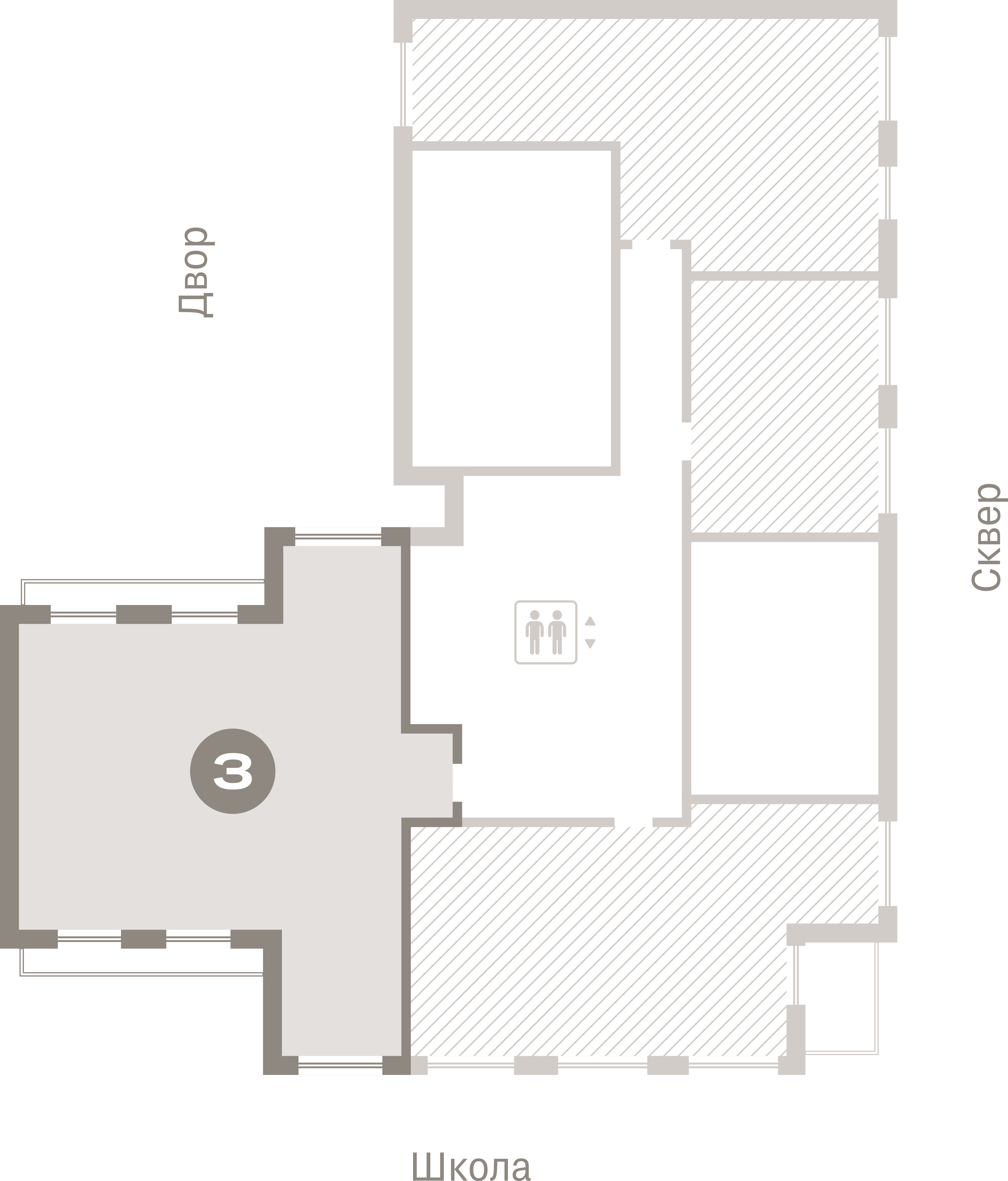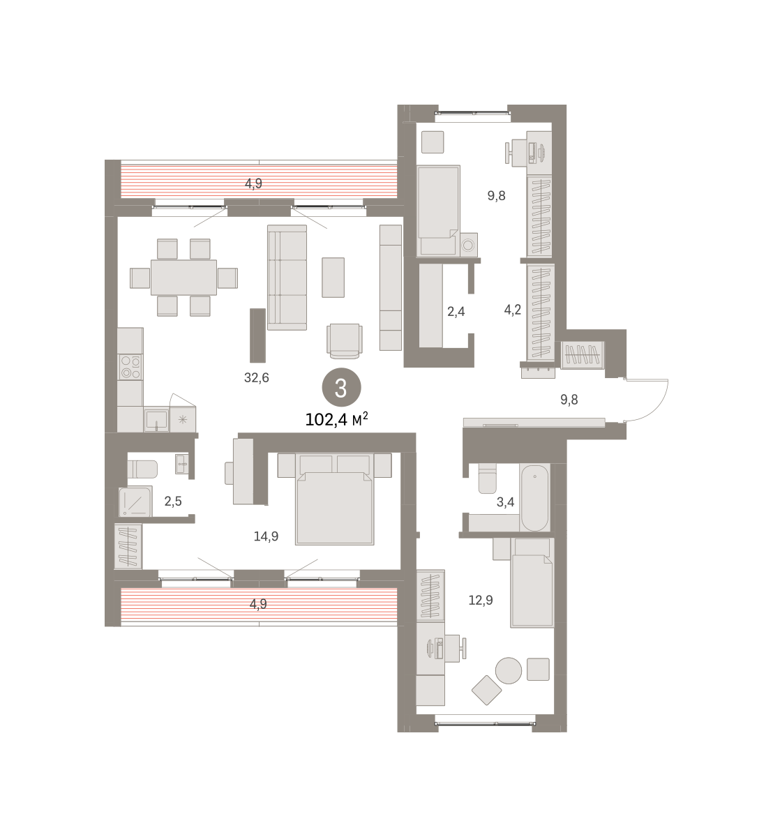 Квартира с кухней-гостиной и тремя спальнями в Бруснике в Академическом. Особенности планировки: вид во двор, второй санузел, гардеробная, мастер-спальня, постирочная, предчистовая отделка, разнесённые спальни, терраса на крыше.