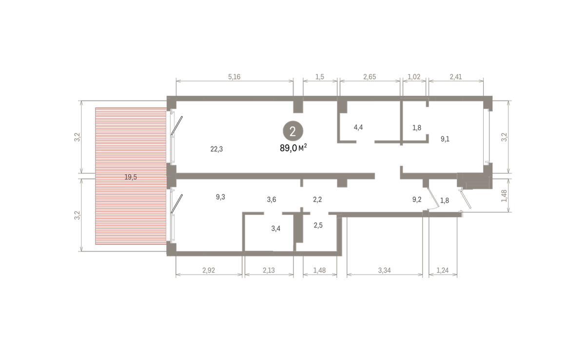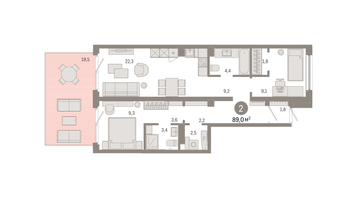 Квартира с кухней-гостиной и двумя спальнями в Бруснике в Академическом. Особенности планировки: вид во двор, второй санузел, гардеробная, двойная выгода, мастер-спальня, окна в пол, отдельный вход, панорамное остекление, постирочная, потолки 3 м и выше, предчистовая отделка, разнесённые спальни, терраса.